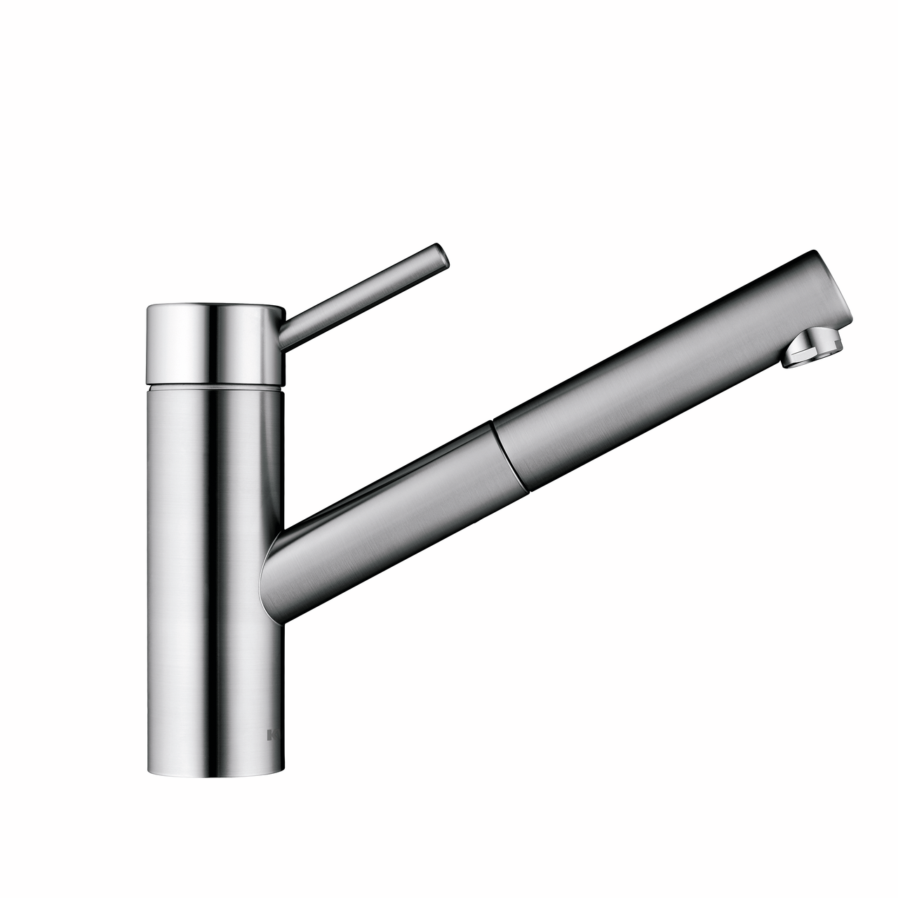 Einhebelmischer. Mit schwenk-/herausziehbarem Auslauf (aus Metall) und Keramikkartusche.