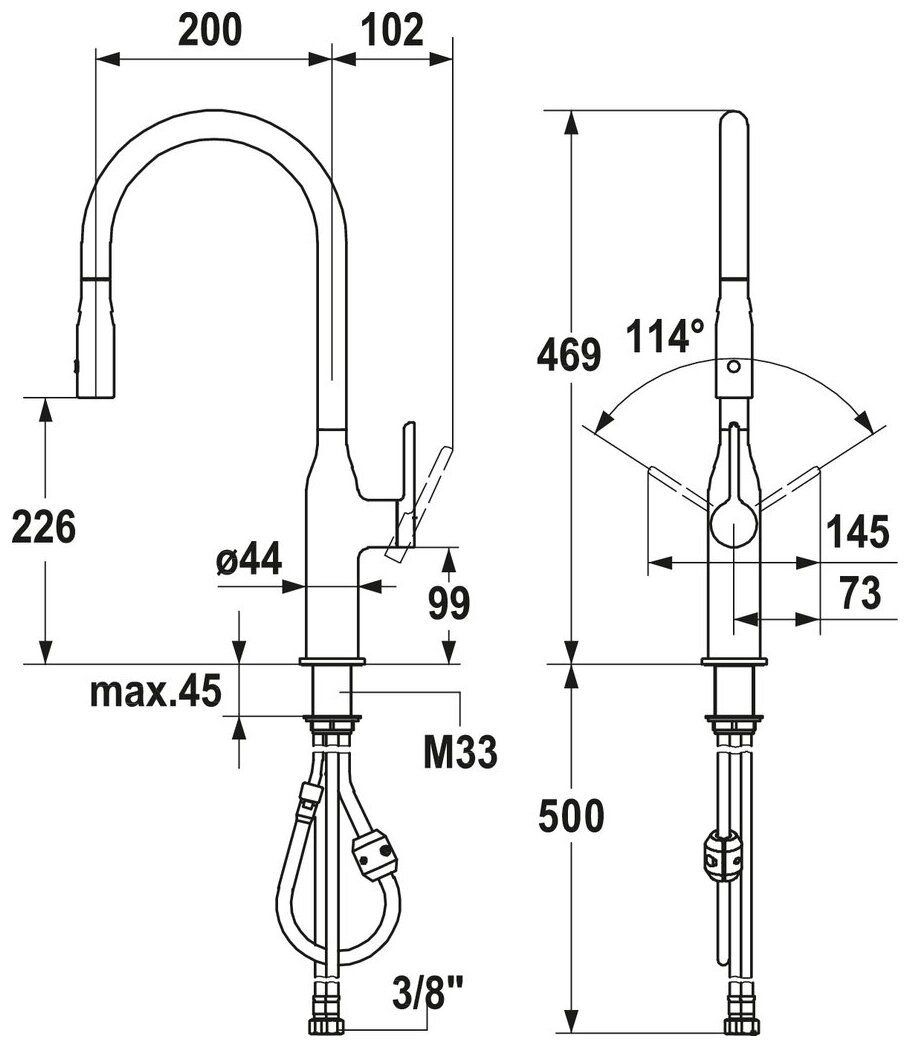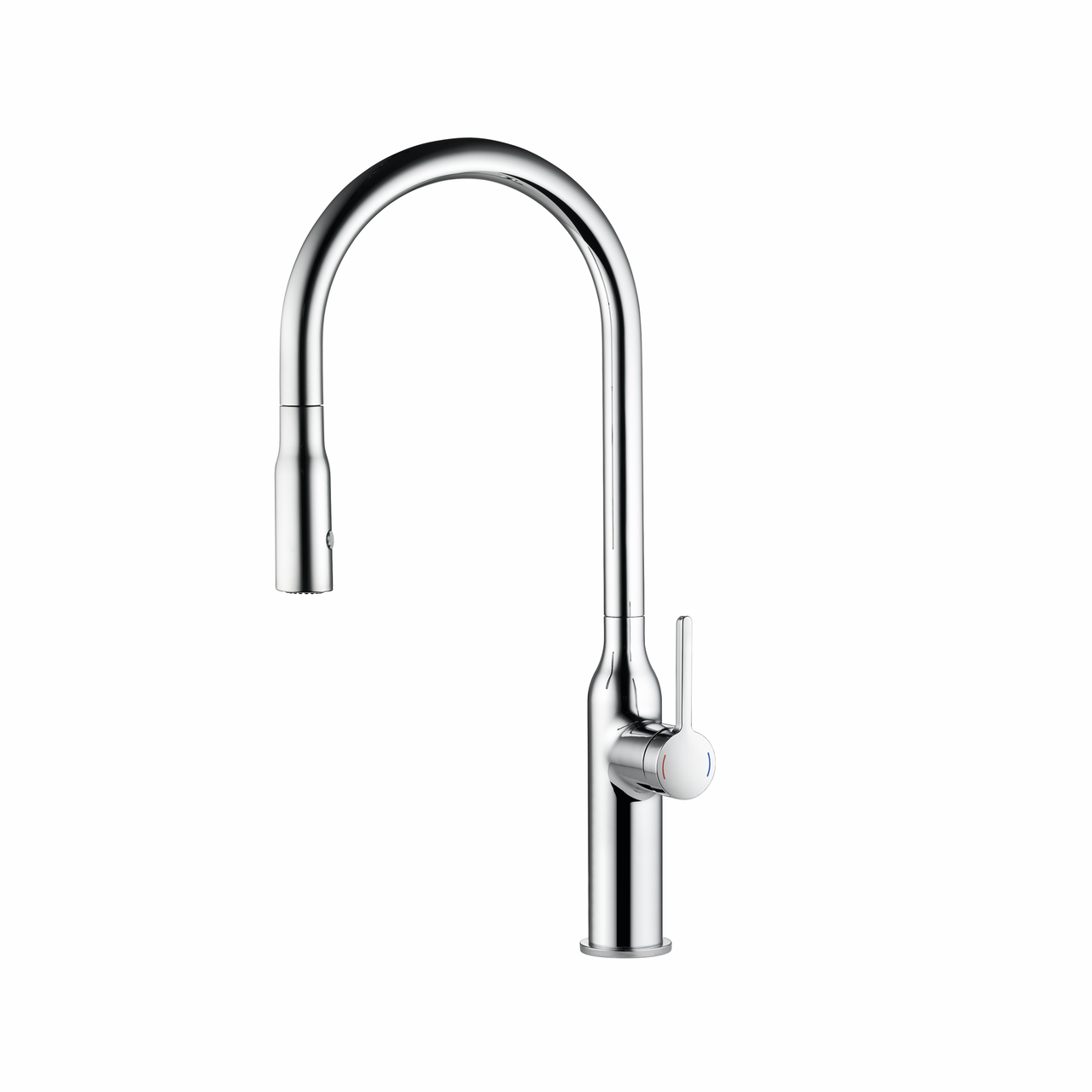 Einhebelmischer. Mit schwenk-/herausziehbarer Schlauchbrause (Strahl/Brause umstellbar), mit seitlichem Hebel und Keramikkartusche.