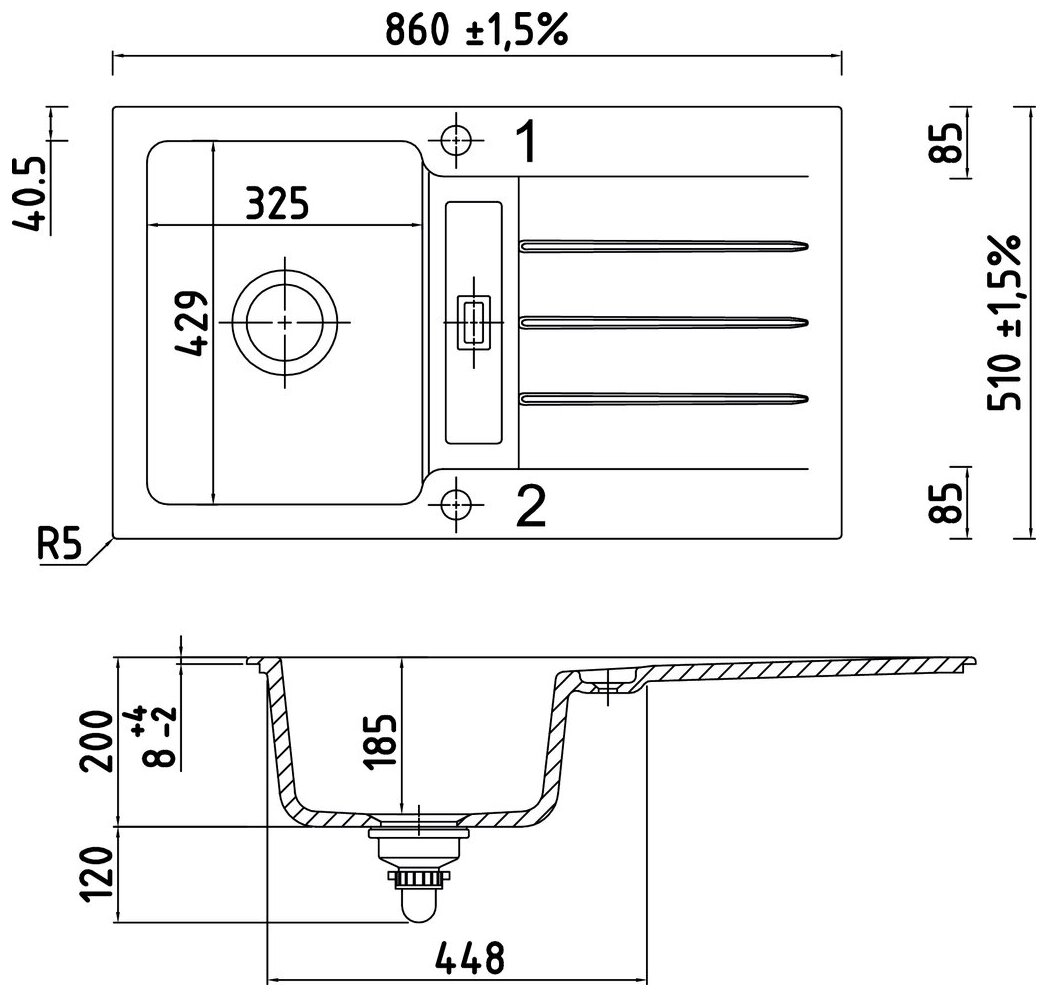 Einbauspüle. Keramik, Einzelbecken mit Abtropffläche, reversibel, 3½" Siebkorbventil mit Premium-Drehexzentergarnitur verchromt, Lochbohrung 1 + 2 durchgebohrt.