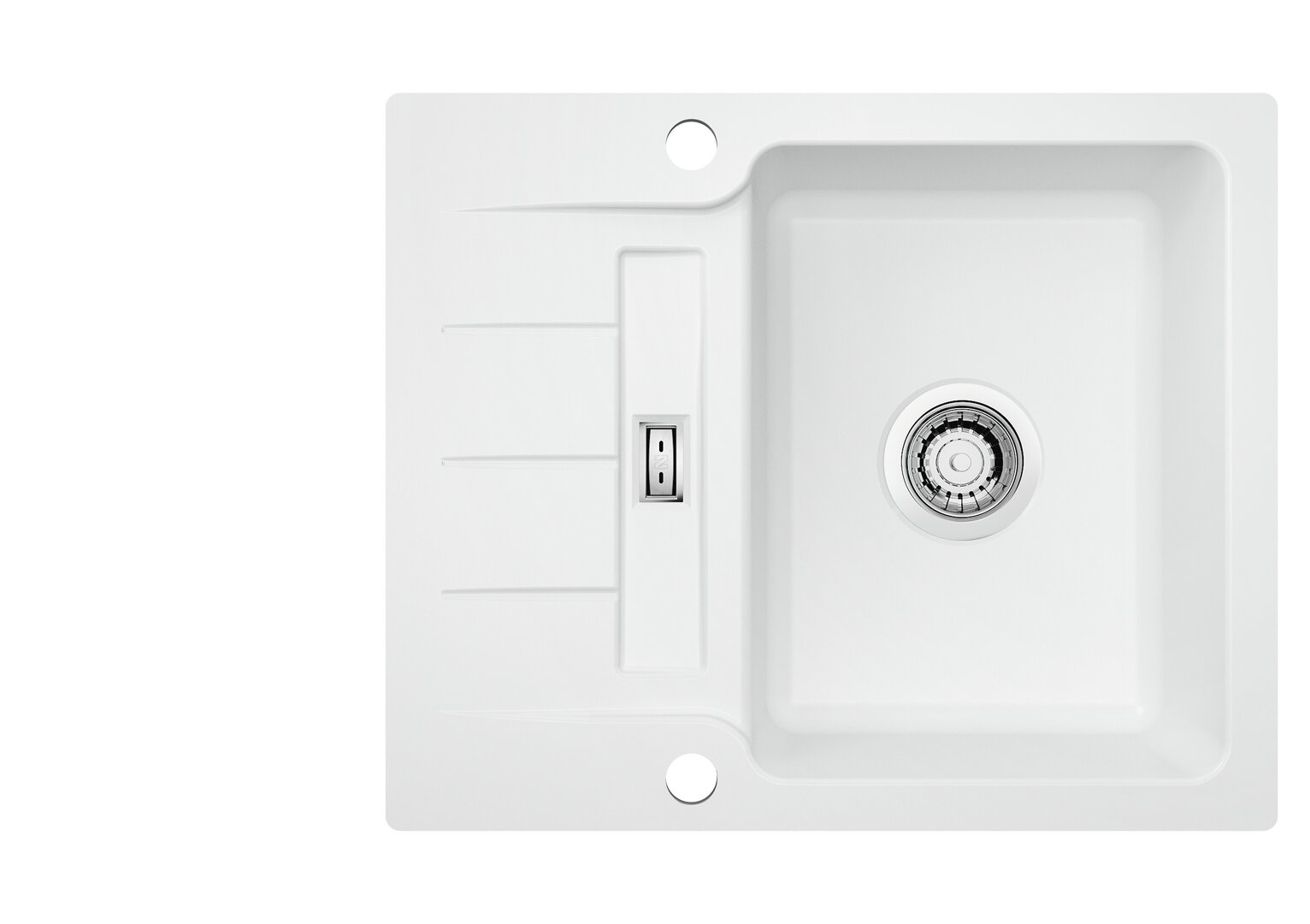 Einbauspüle, flächenbündig. Keramik, Einzelbecken mit kleiner Abtropffläche, reversibel, 3½" Siebkorbventil mit Premium-Drehexzentergarnitur verchromt, Lochbohrung 1 + 2 durchgebohrt.