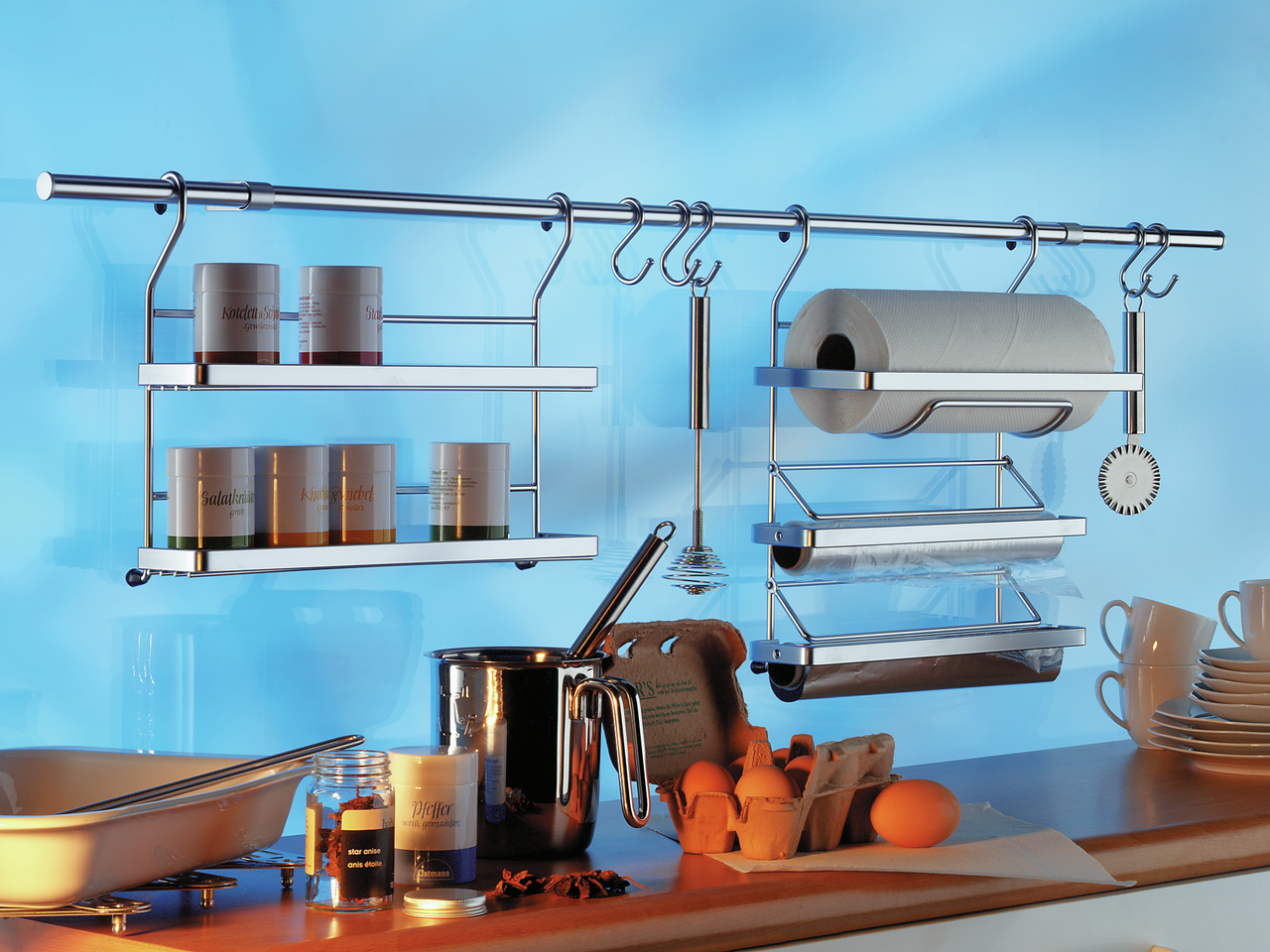 Ein cleverer Helfer im Küchenalltag ist der Linero K 16 Papierrollenhalter 2 für die Küchenreling. Auf der obersten Etage können Papierrollen und Küchentücher griffbereit aufbewahrt werden. Darunter befinden sich zwei Fächer mit praktischer Abrisskante - so lassen sich Alu- und Frischhaltefolie mit einem Griff bequem ablösen. Zur Befestigung wird der Rollenhalter mühelos ohne zusätzliches Werkzeug in das Relingsystem eingehängt.