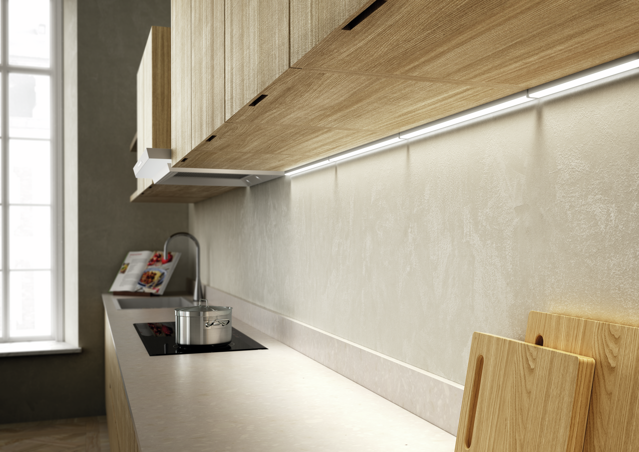 Mit ihrem schmalen Aluminiumprofil wird die Unterbauleuchte Lungo LED dezent an Hängeschränken befestigt. Dank der blendfreien Abdeckung der integrierten LEDs sorgt sie für eine gleichmäßige Ausleuchtung des Arbeitsbereichs innerhalb der Küchenzeile. Die neutralweiße Lichtfarbe ist mit 4000 K und einer Helligkeit von 85 Lumen pro Watt optimal auf alle Tätigkeiten vom Speisen vorbereiten bis hin zum Geschirrspülen abgestimmt. Der Kabelauslass befindet sich auf der rechten Seite der Unterbodenleuchte, wobei die benötigte Zuleitung im Set enthalten ist. Dank ihrer Länge bietet sie reichlich Spielraum bei der Installation. Direkt anschlussfertig, kommt die Leuchte in Verbindung mit dem LED-Konverter 2430 zum Einsatz.