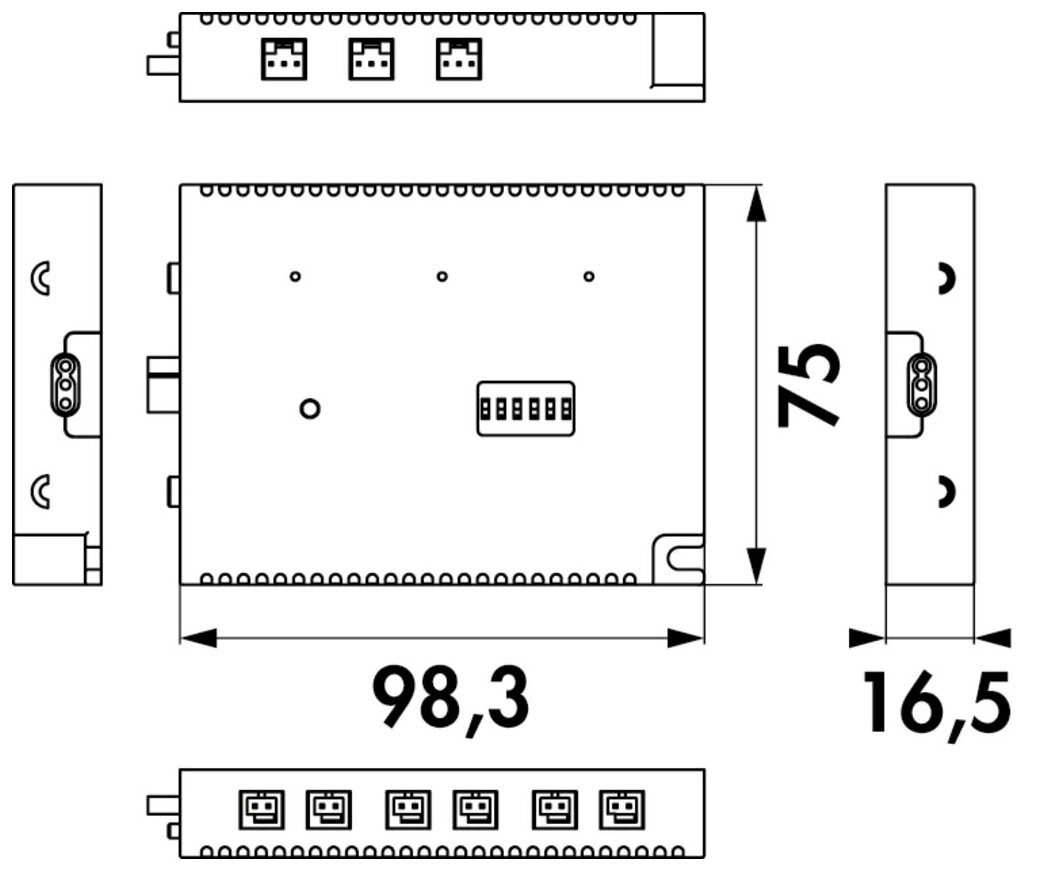 An das Schaltmodul können bis zu drei Leuchtengruppen mit je zwei Steckplätzen angeschlossen über kabelgebundene und/ oder Funk-Sensoren gesteuert werden.