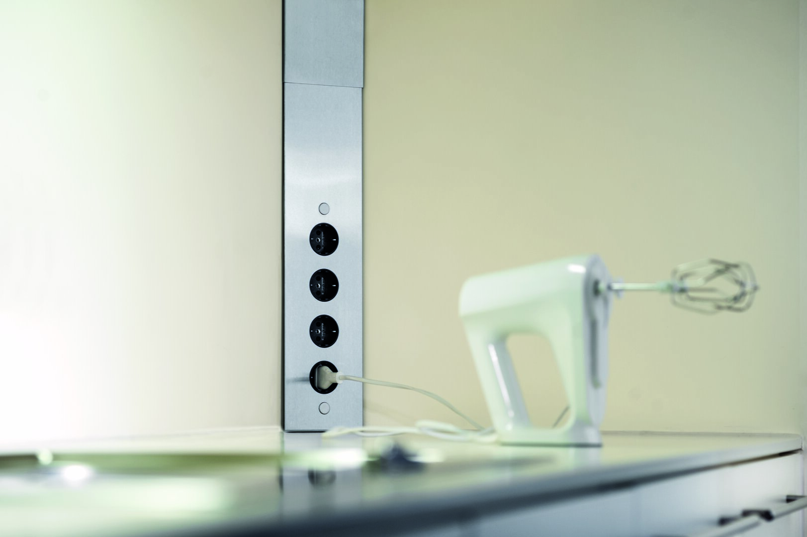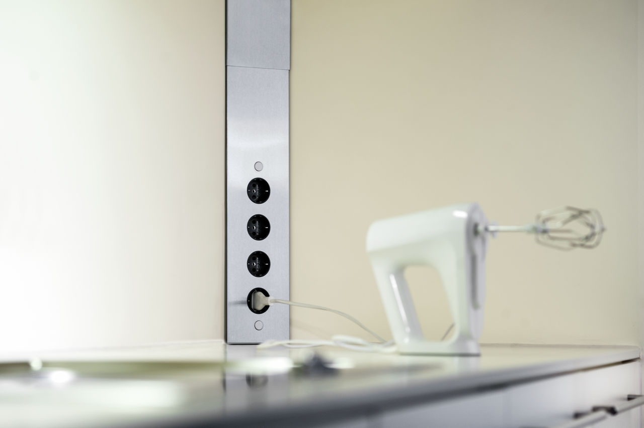 Eine elegante und platzsparende Lösung für die Küchenecke bietet die CON-AKTIV® Ecksteckdose Mira ES1. Mit ihrem modernen und schlichten Design lässt sie sich unkompliziert in das bestehende Einrichtungskonzept integrieren. Zur Ausstattung gehört ein teleskopierbares Ausgleichsstück ohne Endkappen, das zur Höhenanpassung zwischen Küchenarbeitsplatte und Wandschrank dient. Das Steckdosenelement verfügt über vier Steckdosen für den Stromanschluss von Küchengeräten wie Wasserkocher, Handmixer oder Toaster. Zur Installation wird die 4-fach-Steckdose einfach in die Ecke der Arbeitsplatte oder unter dem Wandschrank eingebaut. Zur Herstellung wurde ein langlebiges Material mit pflegeleichter und hygienischer Oberfläche verwendet. Für eine aufgeräumte Optik und leichteren Zugriff auf die Steckdose ist der Kabelauslass hinten oben positioniert. Der Lieferumfang umfasst einen losen Schuko-Stecker.