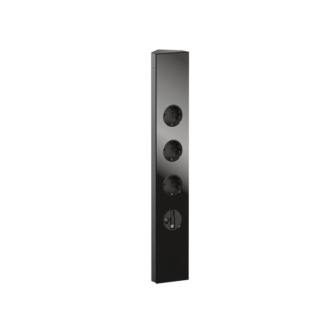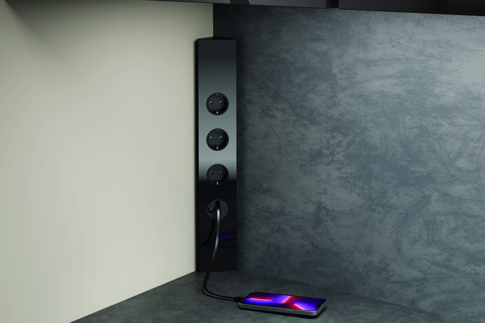 Eck-Steckdosenelement. 3-fach und ausziehbarem USB C Ladekabel. Praktische snap-in und snap-out Funktion des USB-C Steckerkabels im Gehäuse. Frontseite in bedrucktem und kratzfestem Glas, für 90° Ecke.