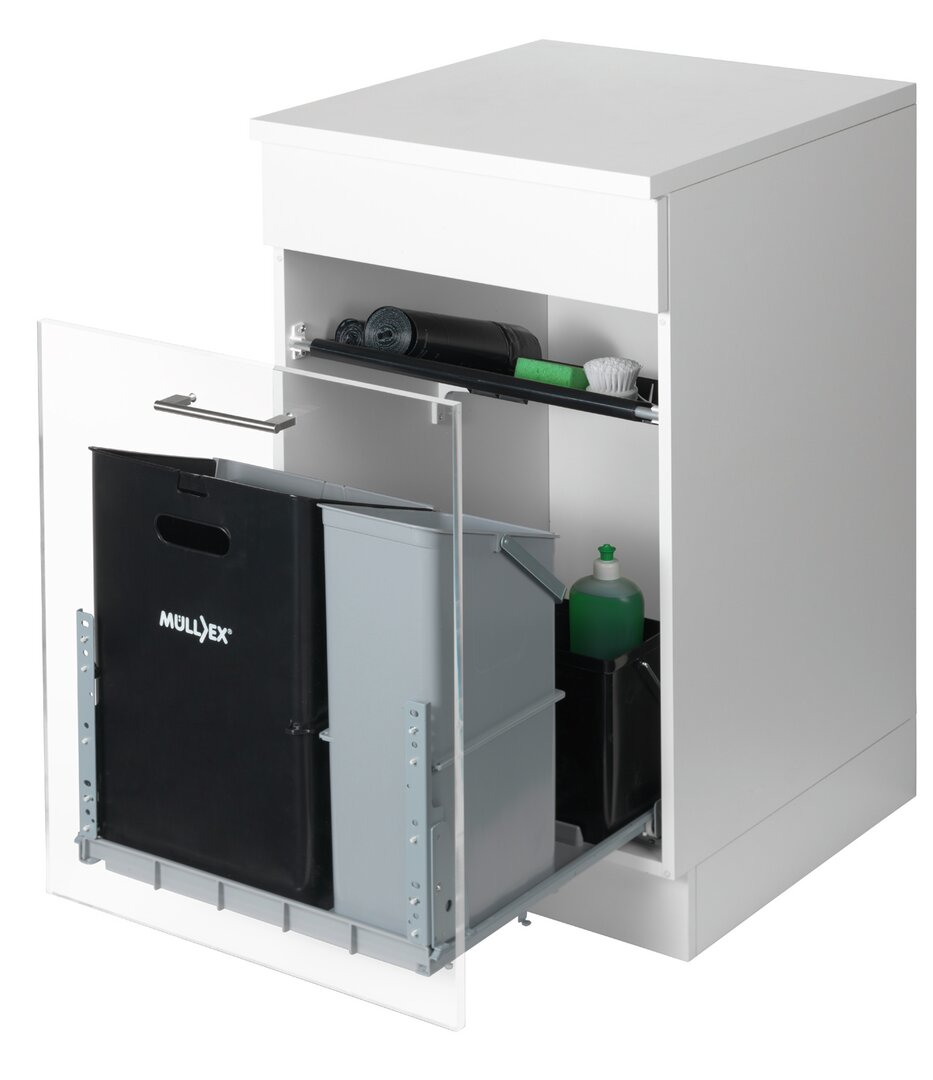 Mit dem Abfallsystem Müllex Comfort 35/17/4/4 werden optimale Voraussetzungen geschaffen, um den anfallenden Haushaltsmüll gezielt zu trennen. Es punktet mit einem äußerst stabilen Vollauszugssystem, das nahezu lautlos funktioniert. Das gesamte Abfallvolumen liegt bei großzügigen 60 Litern. Für die getrennte Entsorgung verschiedener Wertstoffe stehen zwei Behälter mit einem Volumen von 35 Litern und 17 Litern zur Verfügung. Der zugehörige Verschlussdeckel ist fest montiert und kann als Ablage für beispielsweise Müllbeutel und weitere typische Kleinutensilien dienen. Komplettiert wird das Set durch zwei zusätzliche Eimer inklusive Deckel und Tragebügel. Das Füllvolumen liegt bei jeweils 4 Litern. Positionierstege auf dem Boden erleichtern das Platzieren der Behälter. Die Montage des komfortabel bedienbaren Auszugssystems erfolgt auf dem Boden und an der Frontblende des dafür vorgesehenen Küchenschranks.