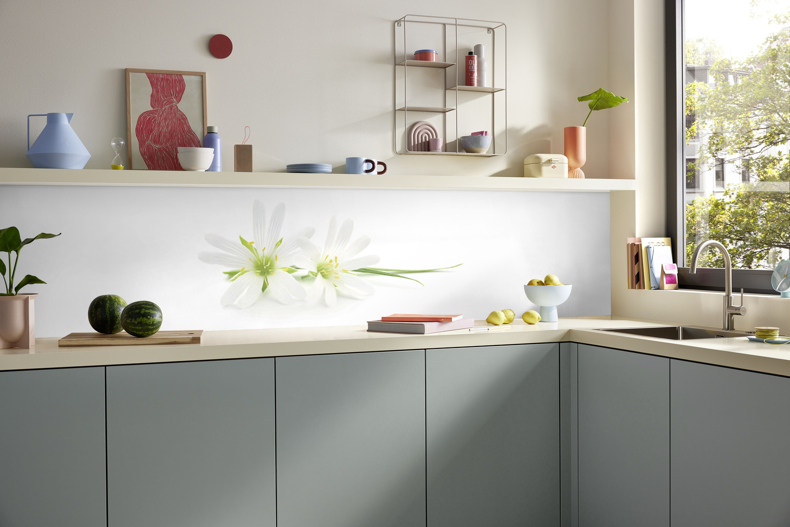Ebenso elegant wie zurückhaltend präsentiert sich die Küchenrückwand PICit® 121 mit ihrem dezenten Blühten-Motiv. Das Einzelmotiv ist auf der Wand frei wähl-, kombinier- und positionierbar. Der Spritzschutz ist mit einer UV-Druckschutzlaminierung ausgestattet, die für eine unempfindliche und pflegeleichte Oberfläche sorgt. Zugrunde liegt eine Plattengröße mit den Maximalmaßen 700 x 3050 mm (H x B). Dabei lässt sich die Größe einfach anpassen. Möglich sind ebenfalls Sondergrößen. Die Blumenplatte stammt aus dem Naber Design-Programm PICit®, das wie die BASICit®-Linie Highlights in der Küchengestaltung setzt. Mit dem interaktiven Naber Nischenrückwand-Konfigurator kann die Platte den persönlichen Wünschen entsprechend angepasst werden. Das betrifft neben Größe, Material und Stärke auch die Oberflächenausführung. Um individuelle Lieblingsbilder als Rückwand zu verwirklichen, lässt sich im Konfigurator ebenfalls das Tool MySCENEit® nutzen.