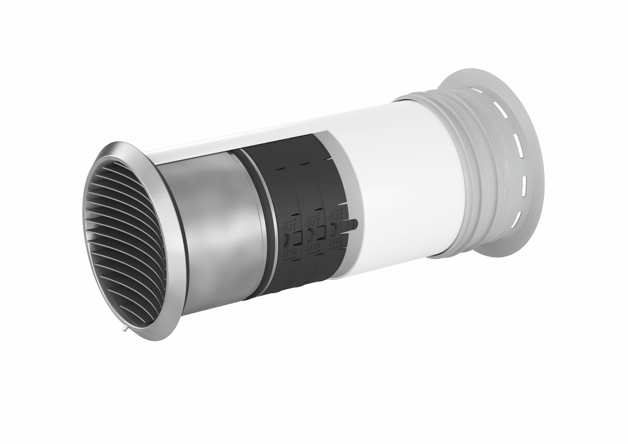 Speziell für Downdraft-Dunstabzugssysteme entwickelt, führt der COMPAIR® PRIME flow P-Turbo 150 Mauerkasten die in der Küche entstehende Abluft geschickt nach draußen. Er eignet sich gleichermaßen für einen bodennahen Wandeinbau wie für den konventionellen Einbau auf Deckenhöhe. Als Modell aus dem patentierten COMPAIR® PRIME flow-Programm besticht es durch ein besonders montagefreundliches sowie ökologisches Design und stammt aus sozial verantwortungsvoller Herstellung. Integriert ist dazu das intelligente THERMOBOX Wärmerückhaltesystem, das ein Eintreten von Zugluft ebenso vermindert wie ein Entweichen von Wärme aus dem Raum. Dabei nutzt das Blower-Door-zertifizierte Rückstausystem einen innovativen Öffnungs- und Schließmechanismus über Magnete. Gefertigt sind die Außenjalousie und die Wanddurchführung aus Edelstahl. Letztere ist für eine maximale Wanddicke von 550 mm vorgesehen und kann auf 220 mm gekürzt werden. Ihr Rohrdurchmesser beläuft sich auf 150 mm. Die Montage erfolgt über das separate Rohbauset mit einer Kernlochbohrung in einem Nenndurchmesser von 162 oder 164 mm. Im Lieferumfang ist ein Hartschaumstopfen sowie eine Wandhülse zur werkzeuglosen Abdichtung von Leckagen.