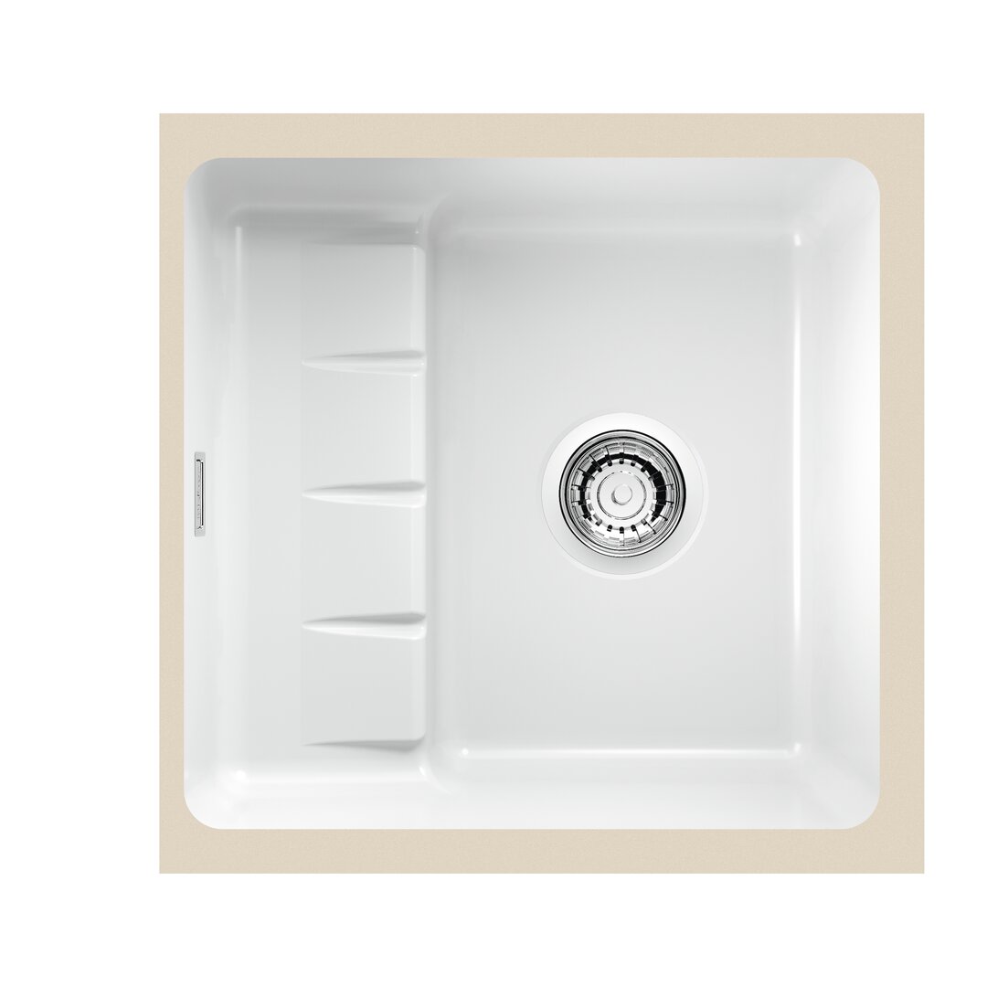 Unterbauspüle. Keramik, Einzelbecken mit zweiter Ebene, reversibel, 3½" Siebkorbventil mit Premium-Drehexzentergarnitur verchromt, ohne Lochbohrung.