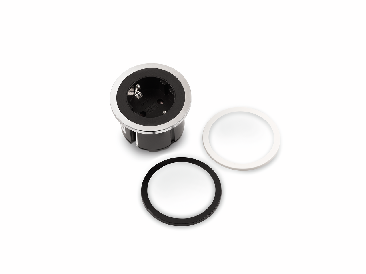 Steckdosenelement, 1-fach. Zierringe edelstahlfarbig, schwarz und weiß. Zum Einbau in Arbeitsplatte, Frontblende oder Seitenwand.