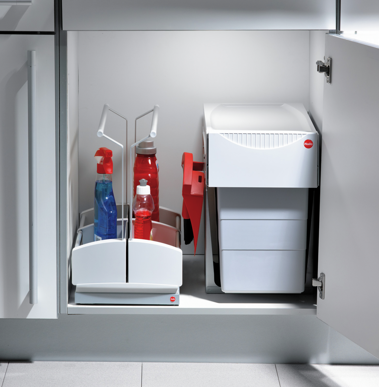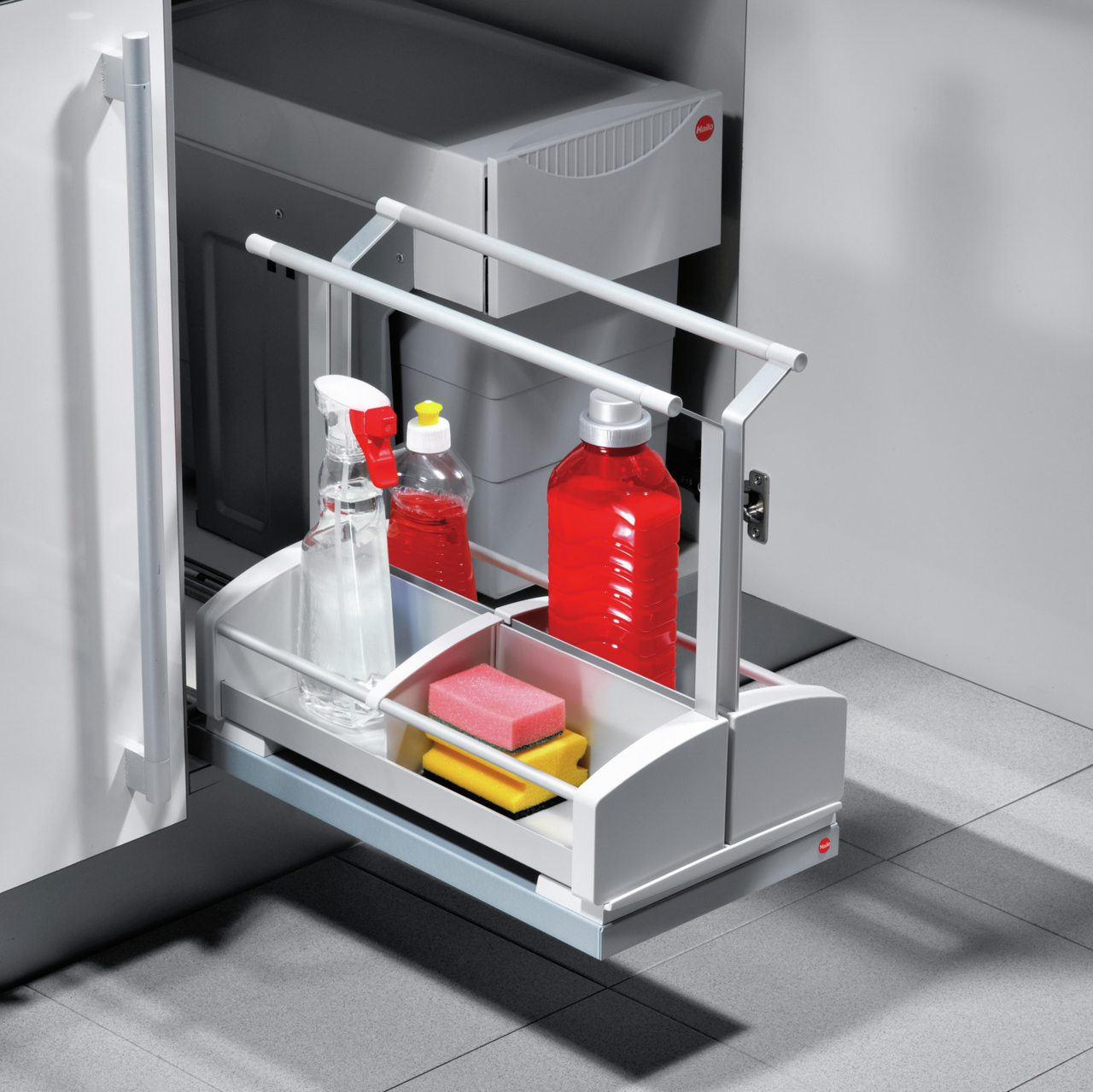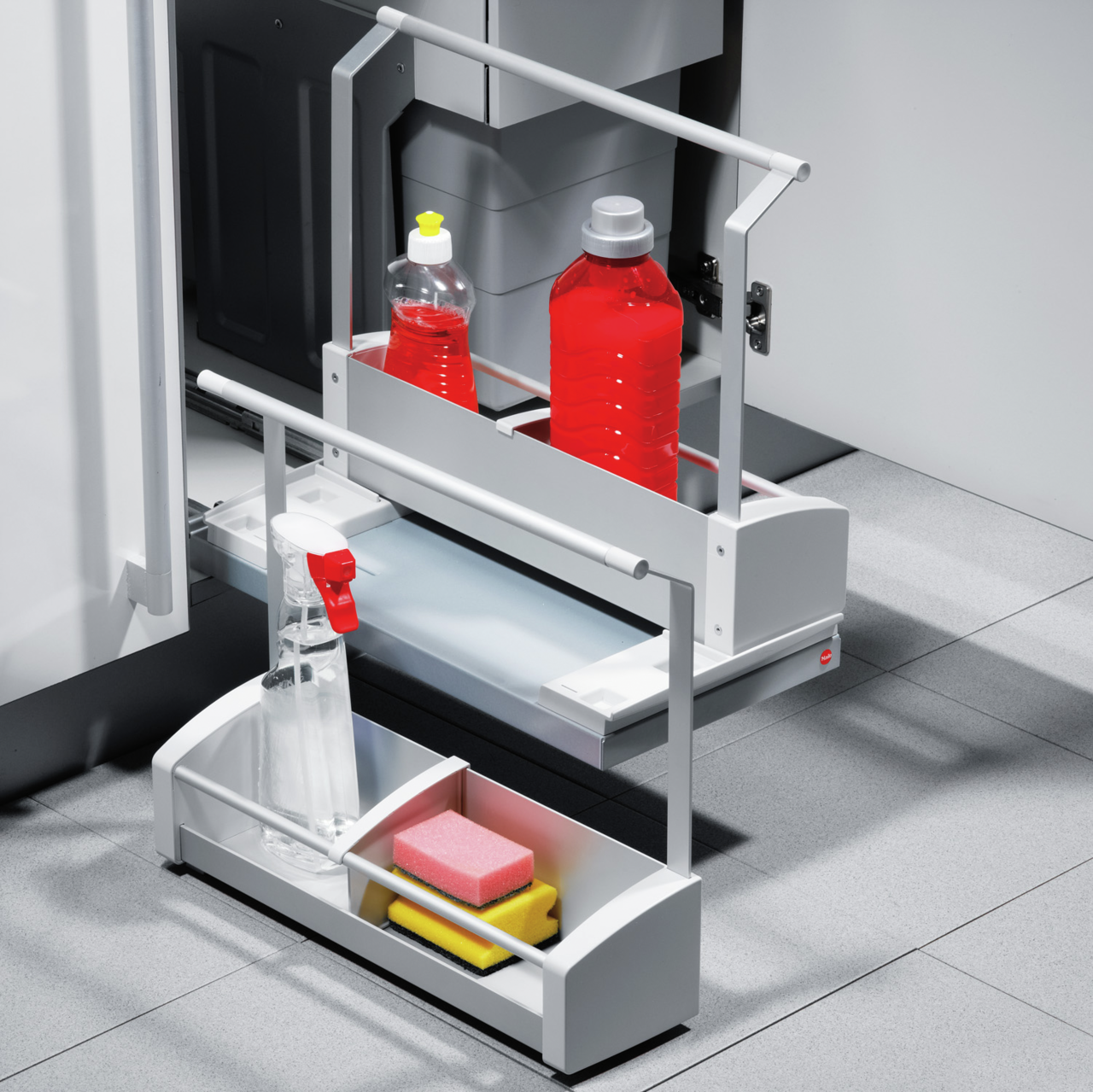 Das praktische Konzept des Putzmittelauszugs Carry beeindruckt im Küchenalltag durch diverse Features. Als Schrankauszug eignet es sich für die Montage in Unterschränken mit einer Drehtür und lässt sich ab einer Schrankbreite von 600 mm mit passenden Mülltrennsystemen kombinieren. Ein hohes Maß an Komfort bietet das dazugehörige Auszugssystem mit Selbsteinzug und Dämpfung, was für ein sanftes und leises Schließen sorgt. Die zum Schrankauszug gehörenden Utensilienkörbe mit Tragegriffen sind herausnehmbar. Die mobile Bauweise erlaubt die Möglichkeit, dass alle benötigten Putz- und Pflegemittel gesammelt und sicher zum Einsatzort getragen werden können. Die Befestigung des Auszugs erfolgt auf dem Schrankboden und ist mit wenigen Handgriffen erledigt.