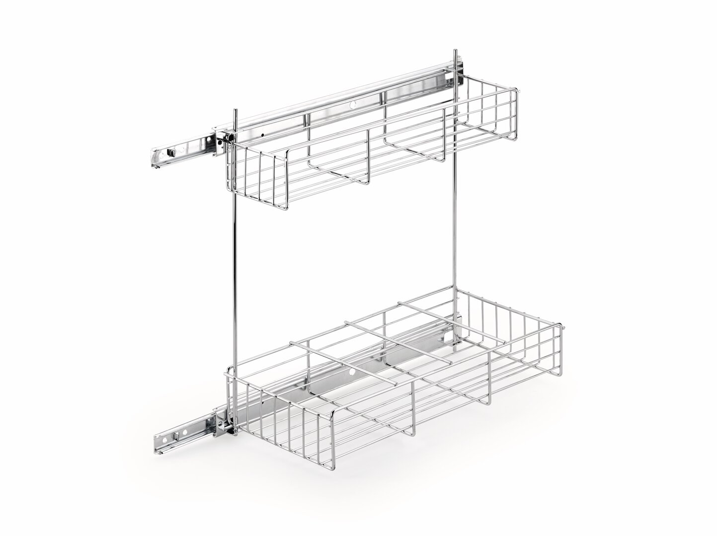 Mit dem Putzmittelauszug Typ 1 lässt sich der Stauraum unter der Spüle clever nutzen. Die beiden Etagen bieten Aufbewahrungsmöglichkeiten für Spül- und Putzmittel, Schwämme und andere Küchenutensilien und sorgen für Ordnung im Küchenschrank. Dank der Auszugsführung bietet der Organizer eine komfortable Bedienung und lässt sich vollständig herausziehen. Das verwendete Chrom zeichnet sich durch eine hohe Stabilität aus und lässt sich einfach reinigen. Mit seiner schicken Chromoptik fügt sich der Auszug harmonisch in jeden Küchenunterschrank ein. Zum Überbrücken der Türscharniere benötigt der Schrankauszug zwei Distanzleisten, die separat erhältlich sind.