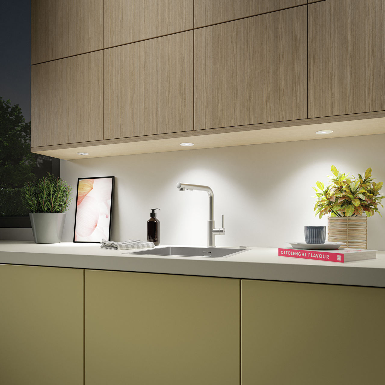 Der Einbaustrahler Riflettore Farbwechsel LED setzt punktgenaue Lichtakzente in der Küche und eignet sich zur Beleuchtung von Arbeitsflächen, Nischen oder Schränken in der Küche. Optisch besticht er durch ein modernes Design, das zu vielen Einrichtungen passt. Mit ihrem hochwertigen Metallgehäuse ist die LED-Leuchte langlebig und besonders robust. Zur Beleuchtung dient eine energieeffiziente LED-Technologie mit hoher Lichtausbeute und geringer Wärmeentwicklung. Angestrahlte Objekte werden nicht erwärmt. Die integrierte Dimmfunktion ermöglicht die stufenlose Regulierung der Helligkeit nach den persönlichen Vorlieben. Je nach Stimmung und Situation lässt sich auch die Lichtfarbe stufenlos in einem Spektrum von Warmweiß (2700 K) bis Kaltweiß (6500 K) einstellen. Um individuelle Beleuchtungskonzepte zu realisieren, lässt sich die Einbauleuchte mit Konvertern und Steuerungsmodulen des LIC LED-Systems kombinieren. Das Lichtsystem kann bequem über Sprachsteuerung oder per Smartphone bedient werden. FW-Funktionskonverter und Schalter sind optional bestellbar. Passend zum Einrichtungsstil lässt sich der Einbaustrahler in unterschiedlichen Farben bestellen.