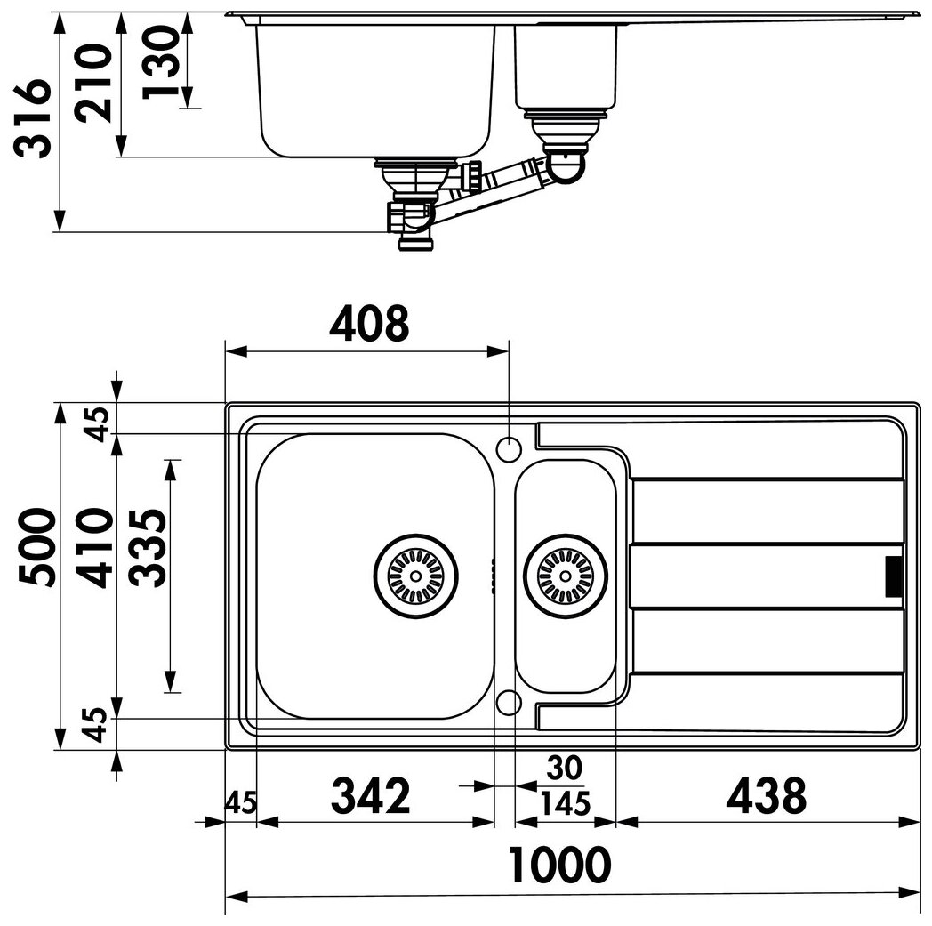 Einbauspüle. Mit Abtropffläche und Restebecken, reversibel. 3½" Siebkorbventil, Drehexzentergarnitur im großen Becken, Restebecken verschließbar.