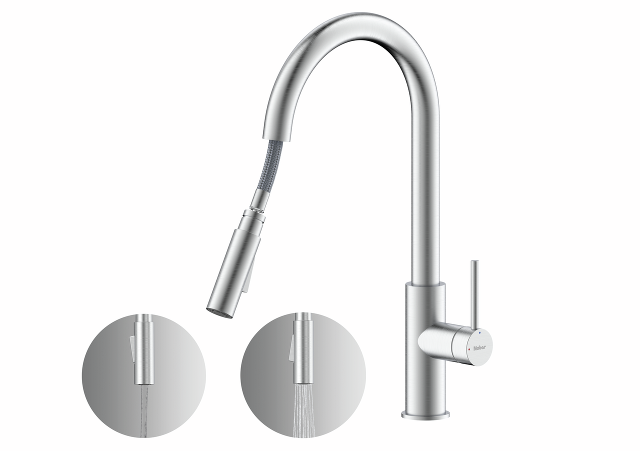 Einhebelmischer. Mit schwenk-/herausziehbarer Schlauchbrause (Strahl/Brause umstellbar), seitlichem Hebel, Laminarstrahlregler und Keramikkartusche.