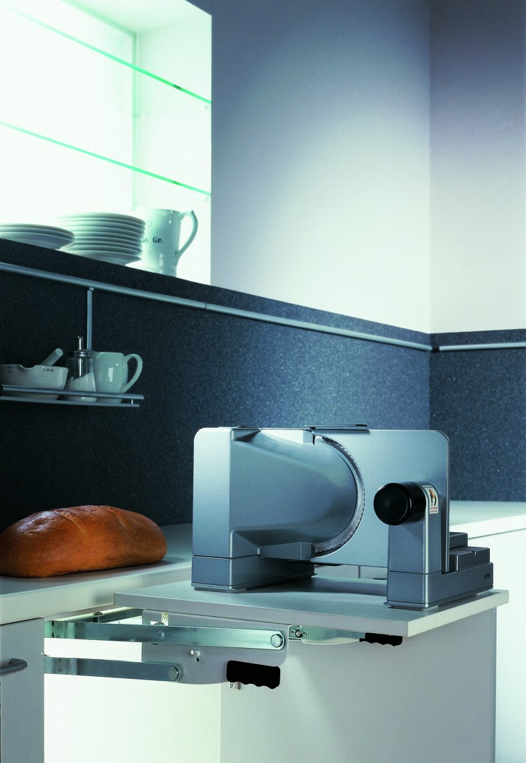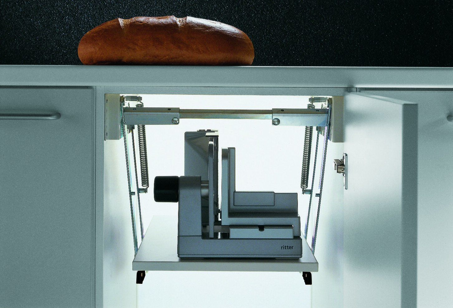 Schwenkt im Unterschrank verstaute größere Geräte, wie z. B. Allesschneider, parallel-horizontal mit vier Federn auf die Höhe der Arbeitsplatte.