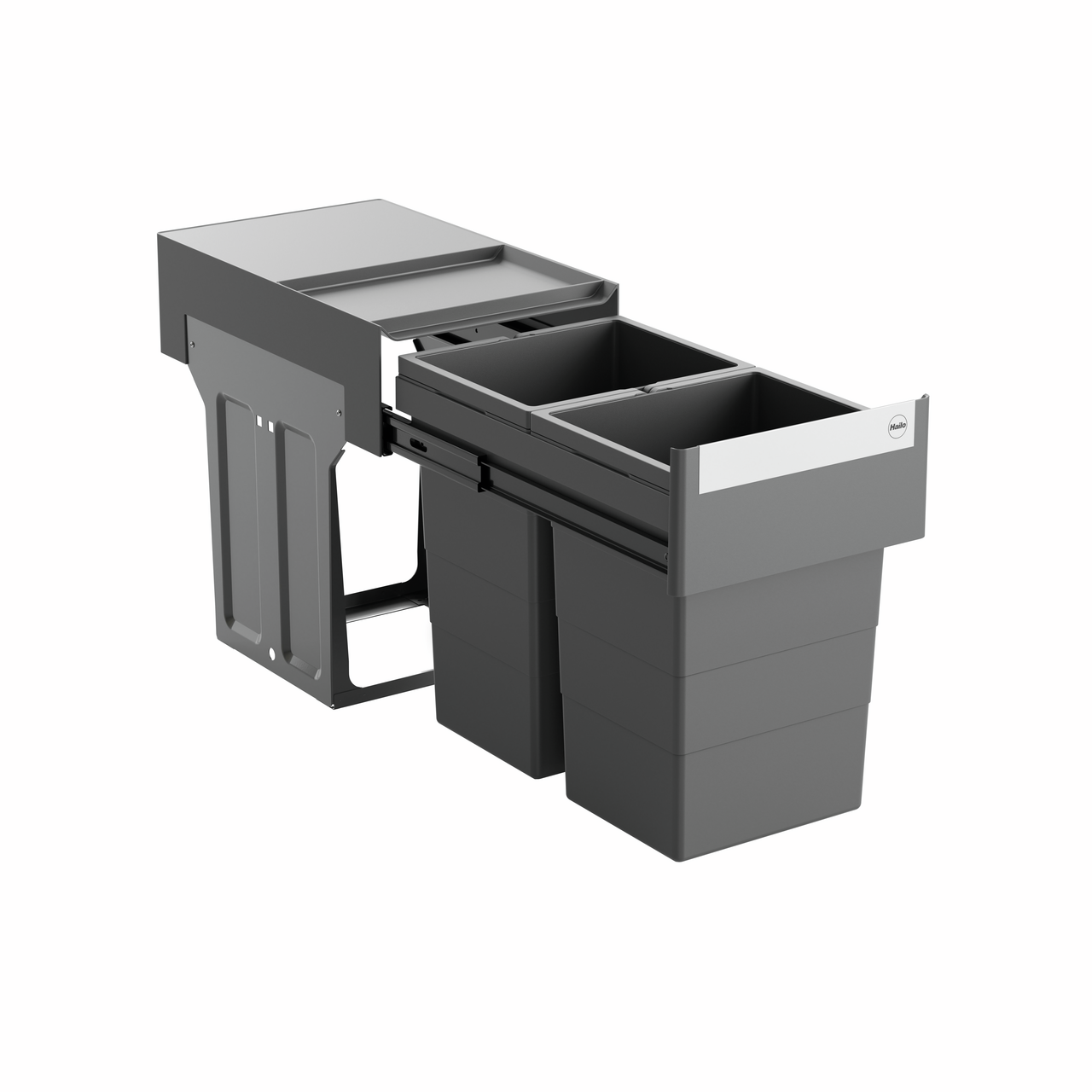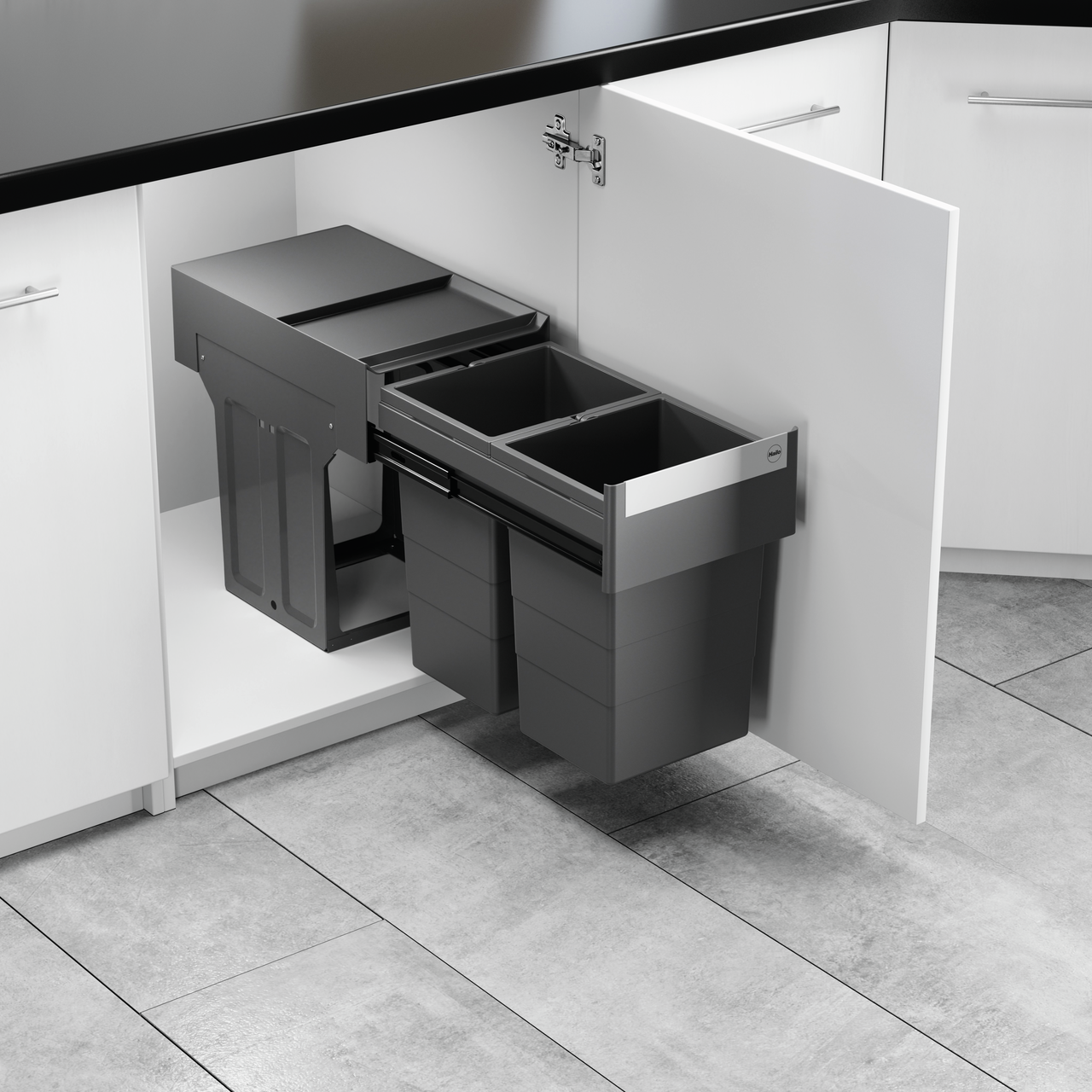 Das Mülltrennsystem Tandem 8 lässt sich dank der schlanken Bauweise in verschiedenste Schränke fügen. Die minimale Einbaubreite liegt bei 400 mm, sodass es selbst in kleineren Drehtür-Unterschränken innerhalb der Küchenzeile Platz findet. Die Füllmenge von 26 Litern verteilt sich mit jeweils 13 Litern gleichmäßig auf die beiden zum Set gehörenden Behälter. Es werden damit die nötigen Voraussetzungen geschaffen, um recycelbare Wertstoffe und Restmüll ordentlich getrennt voneinander zu sammeln. Der auf dem Gestell fixierte Gesamtdeckel ist herausnehmbar und bietet sich als zusätzliche Ablage für Putzutensilien und Müllbeutel an. Das Mülltrennungssystem sitzt auf einem Vollauszug, der einen komfortablen Zugriff auf die Abfallsammler ermöglicht. Die Montage des Haushaltshelfers auf dem Schrankboden erfolgt unkompliziert.