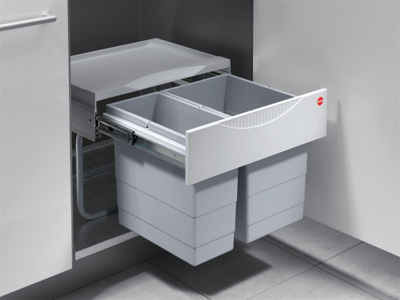 Das Mülltrennsystem Tandem S 2 für Drehtüren lässt sich durch seine geringe Bautiefe von 330 mm platzsparend auch in kleine Spülenunterschränke installieren. Es bleibt schließlich noch genügend Platz für den Siphon, die Wasseranschlüsse und ein Untertischgerät. Dazu bietet der Einbau-Abfallsammler zwei nebeneinander platzierte und herausnehmbare Behälter, die gemeinsam nach vorne gezogen werden können. Sie fassen jeweils 12 und 18 Liter, was insgesamt ein Abfallvolumen von 30 Litern zur Verfügung stellt. Dank des internen Gehäusedeckels werden beide Behälter im eingeschobenen Zustand geruchsdicht verschlossen. Die vorhandene Deckelablage kann zur Unterbringung von Reinigungsmitteln oder anderen Utensilien genutzt werden. Ausgestattet ist der Einbaumülleimer mit einem praktischen Vollauszug, der aus Metall gefertigt ist. Vorgesehen ist er zur unkomplizierten Montage auf dem Schrankboden.