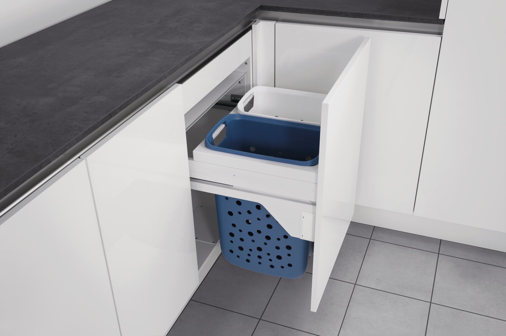 Der Wäschekorb-Auszug Tidy S 600 bietet mit seinem Gesamtvolumen von 66 Litern viel Platz zum Sammeln von Schmutzwäsche. Damit Kleidung nach Farben und Stoffen sortiert und aufbewahrt werden kann, gehören zwei Körbe mit einer Größe von je 33 Litern zum Auszug. Die praktischen Griffaussparungen an den Seiten ermöglichen einen einfachen Transport zur Waschmaschine. Um muffige Gerüche zu reduzieren, sind die Wäschekörbe mit Löchern versehen. Ein vollständiges Herausziehen des Ausziehkorbes und einfaches Einwerfen der schmutzigen Wäsche wird durch den synchronisierten Überauszug ermöglicht. Der abgedeckte und gedämpfte Selbsteinzug sorgt für ein angenehm leises und selbstständiges Einziehen. Durch die Fertigung aus Metall und Kunststoff besticht der Schrankauszug mit einer stabilen und langlebigen Qualität. Zur Montage wird er unkompliziert an der Seitenwand befestigt.
