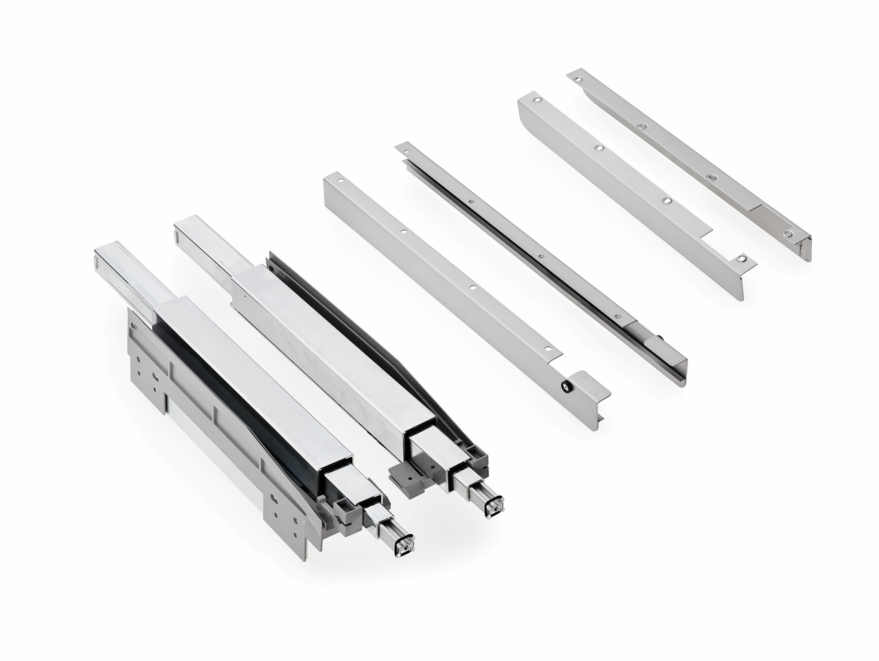 Mit dem Ausziehtisch-Beschlag TopFlex lassen sich Unterschränke federleicht erweitern. Der Schrankbeschlag dient zur Integration eines Ausziehtisches, der nur bei Bedarf zum Einsatz kommt. In der Zwischenzeit versteckt er sich raumsparend hinter einer Schubkasten-Frontblende. Er ist freitragend konzeptioniert und bietet eine absenkbare Frontpartie. Insgesamt lässt sich der Beschlag bis zu 810 mm weit ausziehen. Er kann breitenunabhängig in Schränke mit einem Messwert von 450 bis 900 mm verwendet werden. Dabei sollte die Korpustiefe mindestens 500 mm betragen. Der Auszug besteht aus robusten Materialien und ist hochwertig ausgeführt. Dadurch belauft sich seine Tragkraft auf bis zu 30 kg. Die Montage der Auszugschienen erfolgt in den Seitenwänden des Unterschranks. Der passende TopFlex Ausziehtisch für einen 60er Schrank ist separat erhältlich.