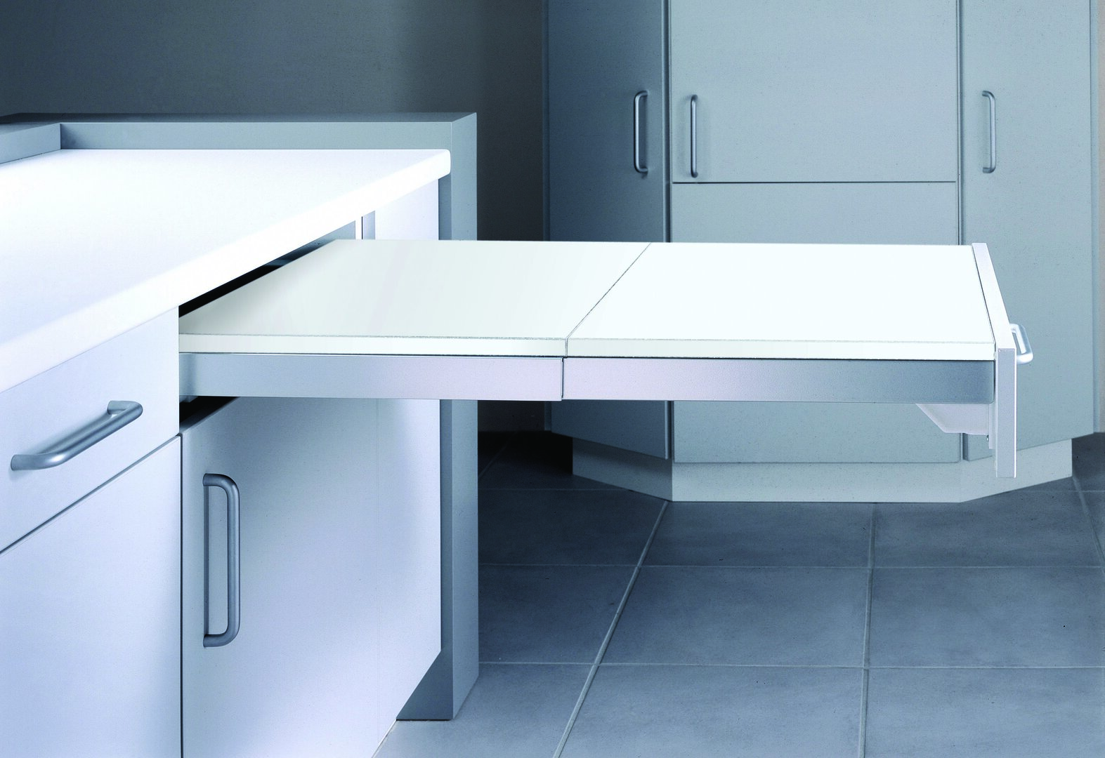 Mit dem Ausziehtisch TopFlex wird der Funktionsumfang passender Küchenunterschränke erweitert. Er befindet sich unsichtbar hinter der Frontblende und wird bei Bedarf mit einem Handgriff herausgezogen. In Weiß gehalten, passt er perfekt zu einer hellen Küchenausstattung. Dank der durchdachten Konstruktion steht eine großzügig bemessene Arbeitsplatte zum Vorbereiten von Speisen zur Verfügung, alternativ kann die Fläche als Ablage genutzt werden. Ein zusätzlicher Vorteil ist die absenkbare Front. Bei der Fertigung des ausziehbaren Tischs kommt langlebiges Material mit melaminbeschichteten Oberflächen zum Einsatz, die sich als besonders pflegeleicht erweisen. Die Lieferung erfolgt vormontiert, sodass die Integration in den dafür vorgesehenen Unterschrank ganz einfach von der Hand geht.