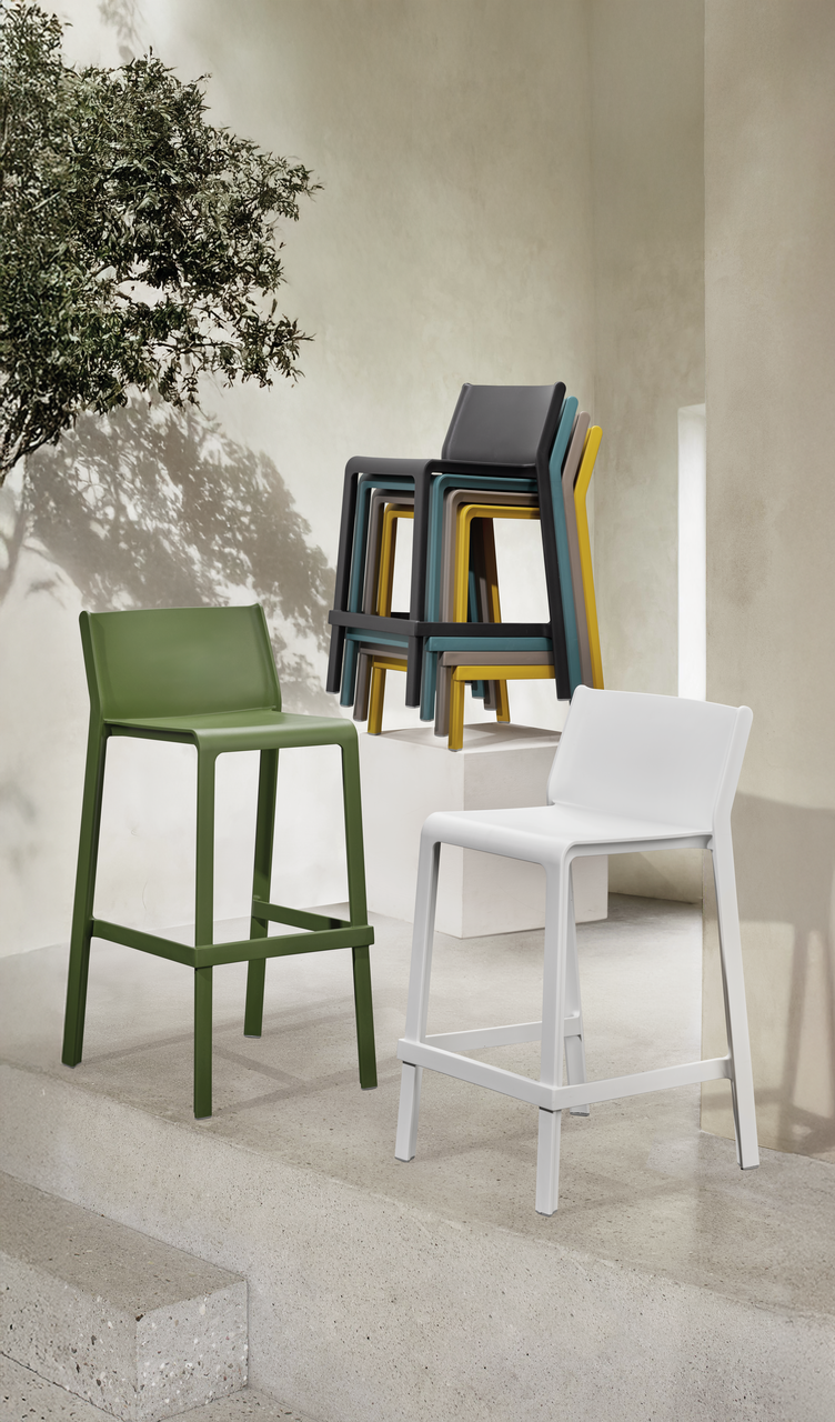 In einem eleganten und zugleich dekorativen Stil präsentiert sich der Barhocker Trill 2 für die Küche und den Essbereich. Er ist mit einer geschlossenen Rückenlehne ausgestattet, sodass ein angenehmer Sitzkomfort entsteht. Verbindungsstege zwischen den Standfüßen werden zum Hochlegen der Füße genutzt, um eine noch bequemere Haltung einzunehmen. Der Barstuhl wird in einer exzellenten und stabilen Qualität aus komplett recycelbarem Fiberglas-Polypropylen gefertigt. Die UV-Beständigkeit des Materials erlaubt es, ihn saisonal oder parallel als Outdoor-Stuhl auf der Terrasse sowie im Garten zu nutzen. Er ist leicht transportierbar und lässt sich platzsparend stapeln. Zu den optisch markanten Erkennungsmerkmalen zählen die Oberflächen mit einem veredelnden Matteffekt in unterschiedlichen Farbausführungen.