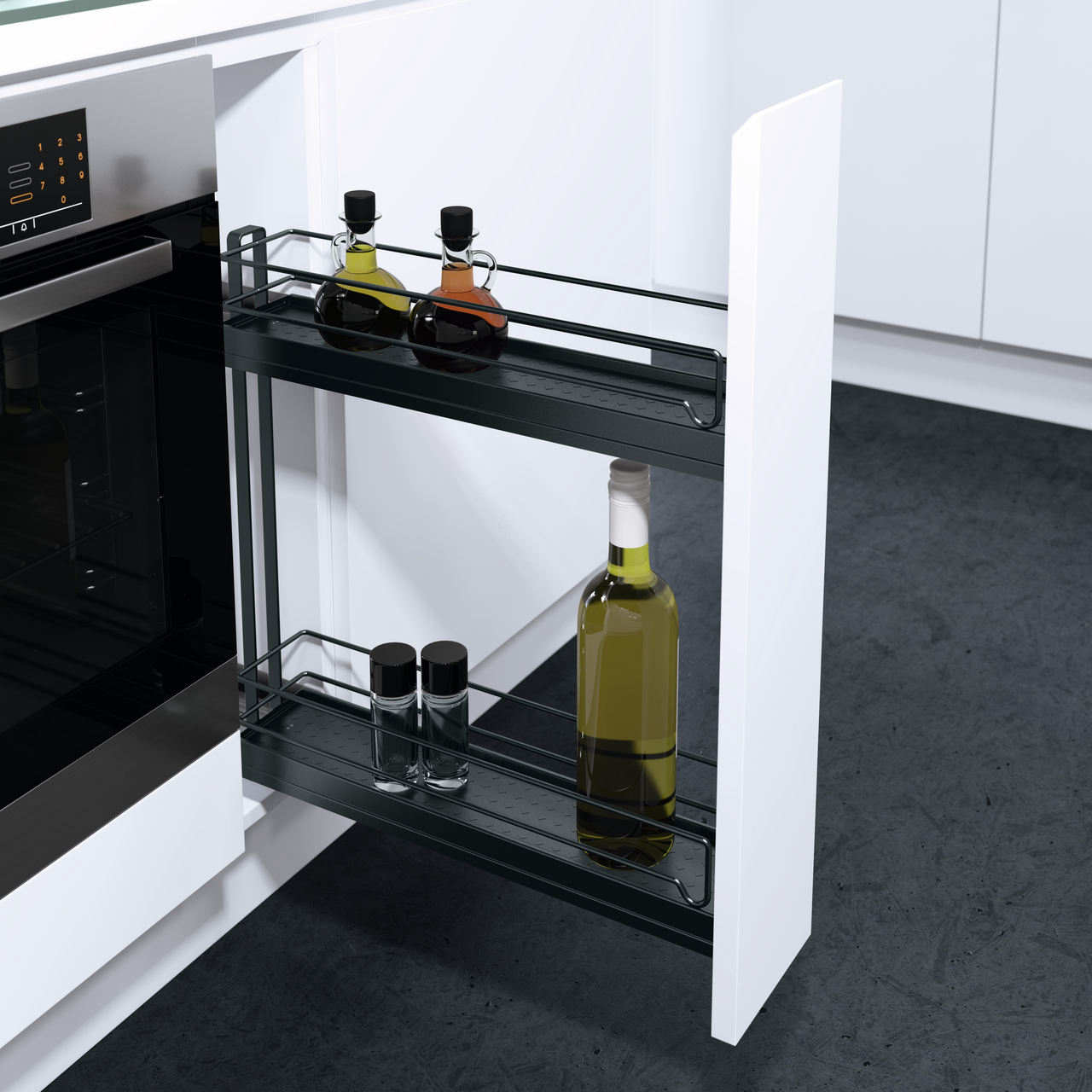 Der Etagenauszug VS SUB Slim ist eine intelligente Lösung, um selbst kleinste Nischen und Zwischenräume in modernen Küchenunterschränken sinnvoll zu nutzen. Er bietet sich als zusätzliche Ablage beispielsweise für Lebensmittelvorräte oder Putzmittel an. Für die Integration mit dem Anschlag auf der rechten Seite ist eine minimale Korpusbreite von lediglich 150 mm erforderlich. Zur Grundausstattung des durchdacht konzipierten Systems gehören zwei Ablageelemente, die bedarfsgerecht verwendbar sind. Dank der integrierten Dämpfung schließen die beiden Führungselemente im Zusammenspiel mit dem Selbsteinzug leise und materialschonend. Die Montage erfolgt an der rechten Innenseite des dafür vorgesehenen Unterschranks. Wahlweise steht der Auszug in den Varianten Chrom und Silber zur Verfügung.
