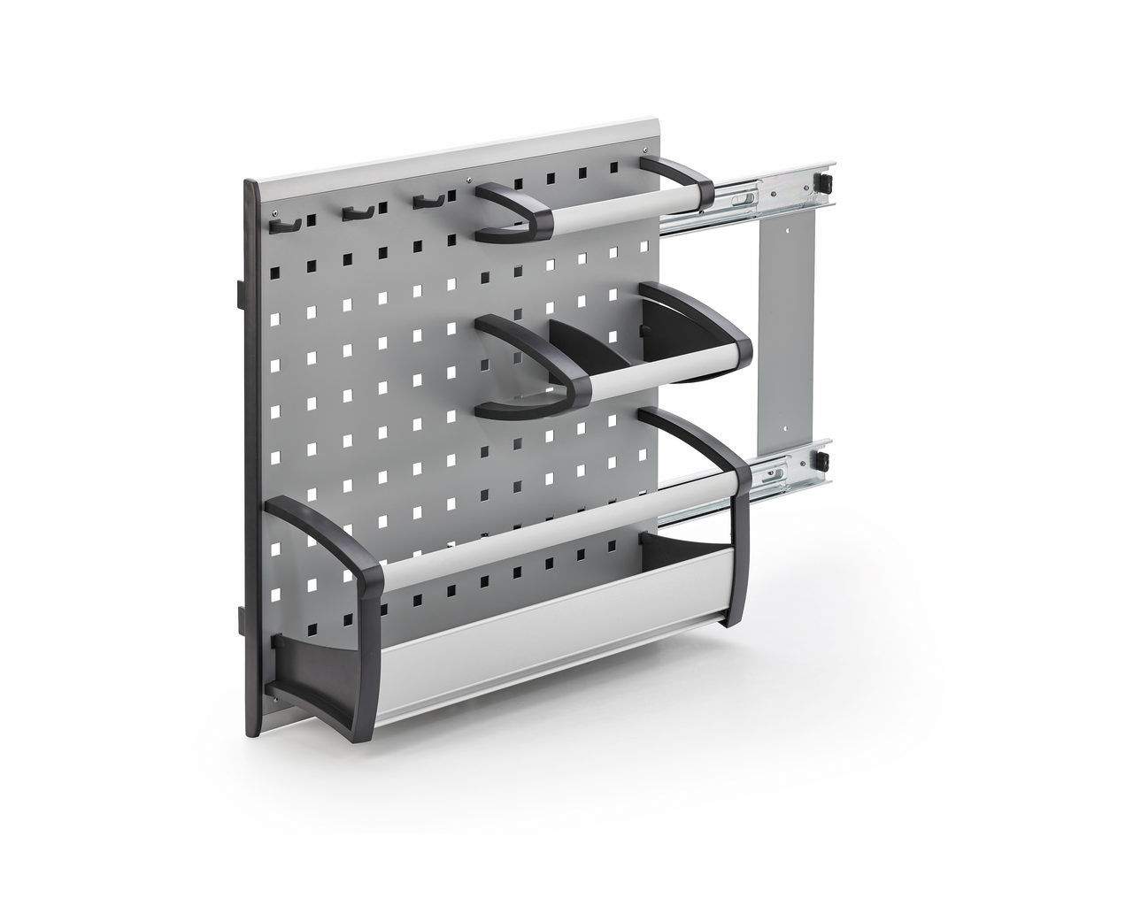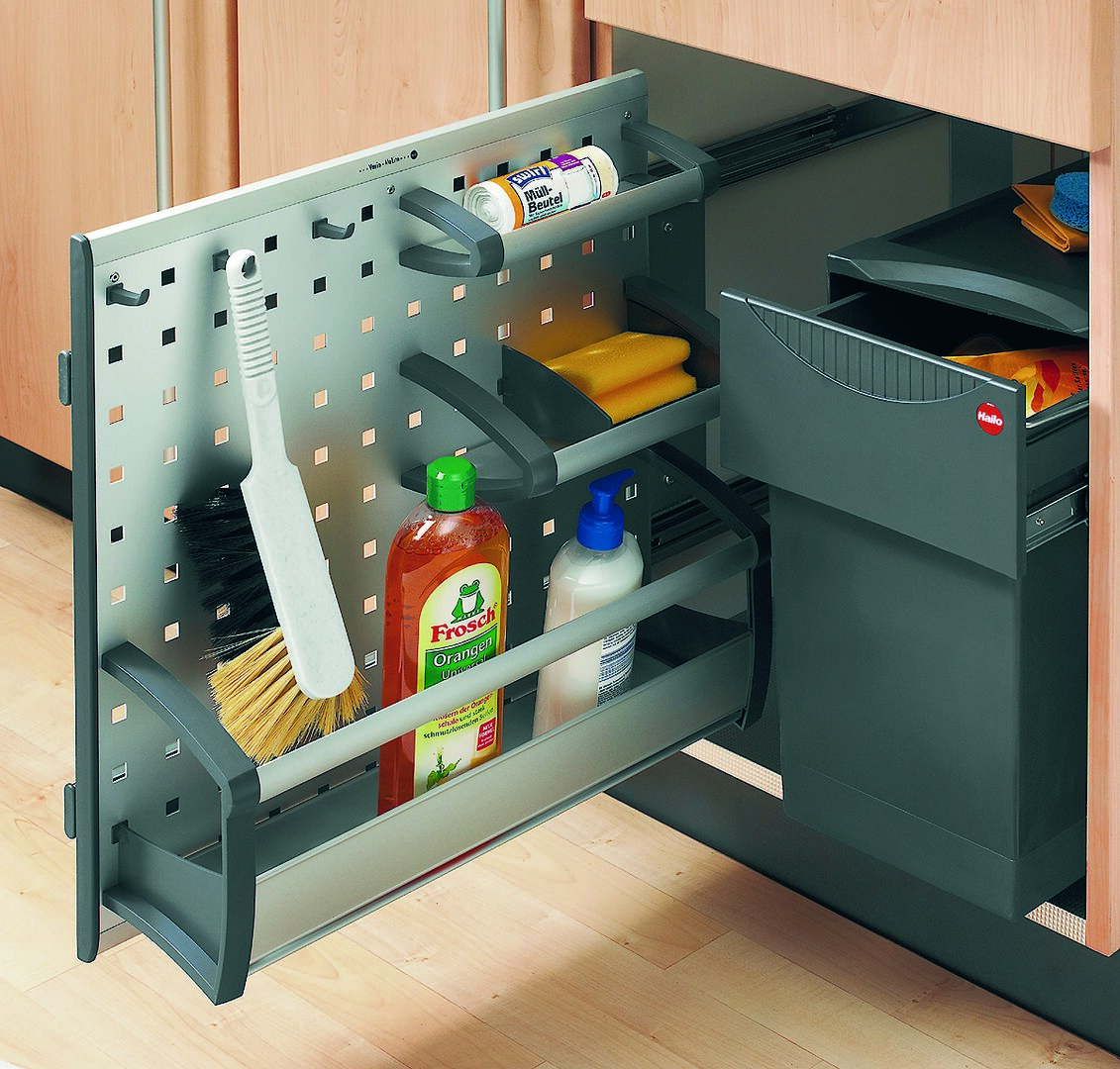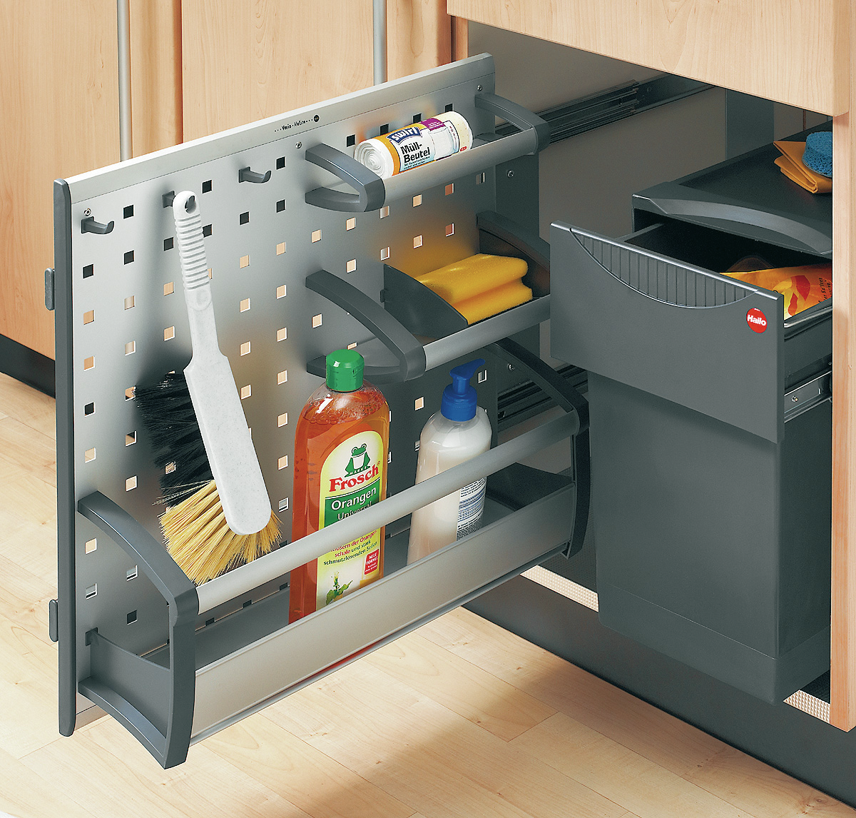 Das dreiteilige Vario-Ordnungssystem 3909 macht Schluss mit unübersichtlichen Schrankinhalten in der Küche. Es ist zum Einbau im Unterschrank vorgesehen und fügt sich platzsparend neben dem Einbaumülleimer ein. Durch das elliptische Design, die eloxierten Aluminiumprofile und die quadratisch gelochte Grundplatte erhält der Putzmittelauszug seinen exklusiven Charakter. Dazu sind formstabile Kunststoff-Elemente kombiniert. Der Organizer stellt eine große und zwei schmale Schalen für Putzmittel und Utensilien sowie drei Haken zur Verfügung. Die einfache Montage des Ausziehkorbs erfolgt in der linken oder rechten Seitenwand des Unterschranks.