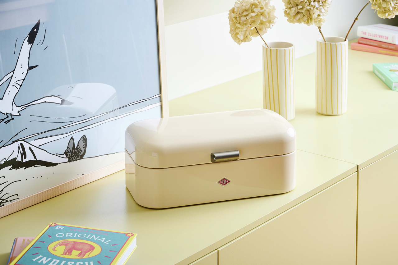 Die große Brotbox hat Lüftungslöcher auf der Rückseite, die für eine optimale Belüftung des Inhalts sorgen. Die Metallscharniere, mit denen der Deckel befestigt ist, und der Handgriff sind aus stabilem Metall und halten so einiges aus. Den Grandy® gibt's natürlich in vielen tollen Wesco-Farben.