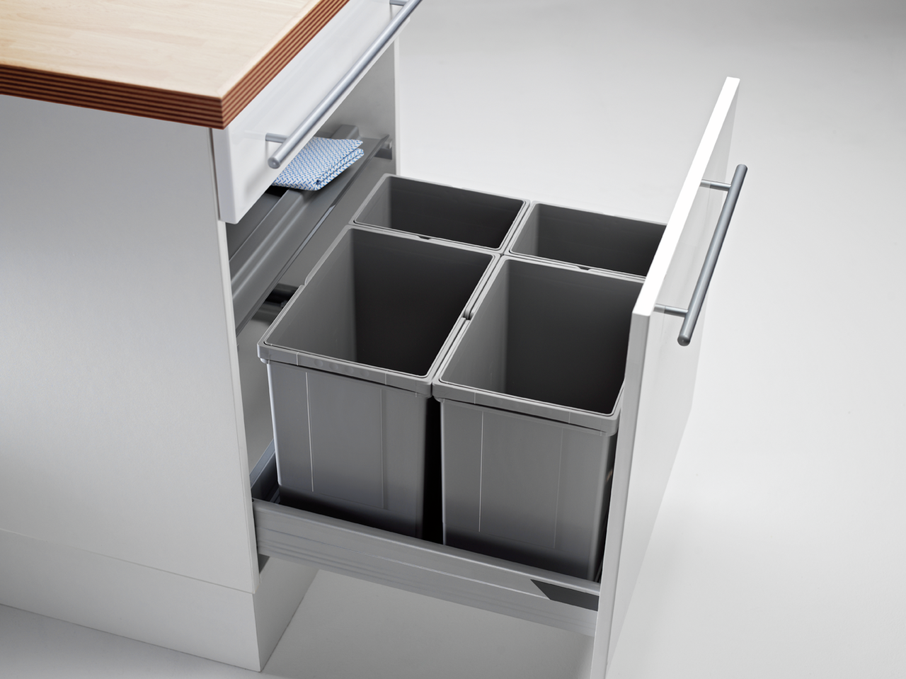 Als wahrer Raumsparer erweist sich das Abfalltrennsystem Pullboy Vario 320 S/600-4. Es ist für bestehende Frontauszüge in der Küche entwickelt und passt bei Korpusbreiten von 600 mm. Dabei benötigt die Mülltrennung nur eine Einbauhöhe von 320 mm. Das System umfasst vier eckige Abfallbehälter in den Größen 8 und 17 Liter. Dadurch ergibt sich ein Gesamtvolumen von 50 Litern. Die herausnehmbaren Container lassen sich beliebig im Auszug arrangieren. Mit dem feststehenden Gesamtdeckel werden alle Behälter verschlossen. Dieser kann auch als Ablagefläche für Müllbeutel genutzt werden. Gefertigt ist der Müllsortierer aus langlebigem Kunststoff in der neutralen Farbe Alugrau. Dank der zuschneidbaren Antirutscheinlegematte lassen sich die Eimer fixieren. Vorgesehen ist das Abfallsammelsystem zur Montage auf dem Schrankboden und an der Frontblende.