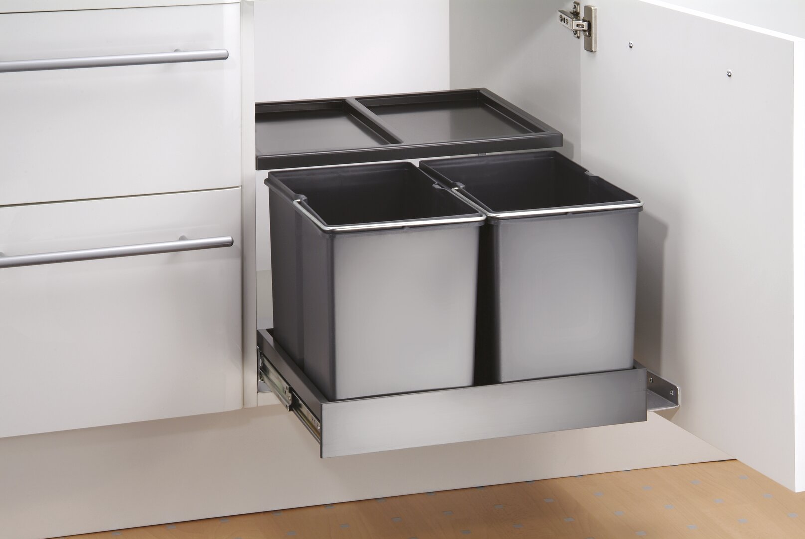 Das Mülltrennsystem Double Shorty plus bereichert den Küchenalltag mithilfe des integrierten Mitnehmers für Schränke mit Drehtüren. Ein praktisches Feature, da kein zweiter Handgriff notwendig ist, um anfallende Wertstoffe und sonstigen Müll getrennt zu entsorgen. Aufgrund der geringen Einbauhöhe eignet sich das Mülltrennungssystem auch für die Montage in Spülenunterschränken. Das Set mit einem Gesamtvolumen von 30 Litern besteht aus zwei Behältern mit jeweils 15 Litern Fassungsvermögen, sodass reichlich Platz für eine ordnungsgemäße Mülltrennung in der Küche vorhanden ist. Der zugehörige Gesamtdeckel dient dazu, die typische Geruchsbildung im Raum beispielsweise durch Biomüll zu unterbinden. Der Zugriff auf die Abfalleimer gestaltet sich dank des Vollauszugs inklusive Mitnehmer spürbar einfach. Das System wird direkt an der Drehtür befestigt, wobei ein Öffnungswinkel von 110° benötigt wird.