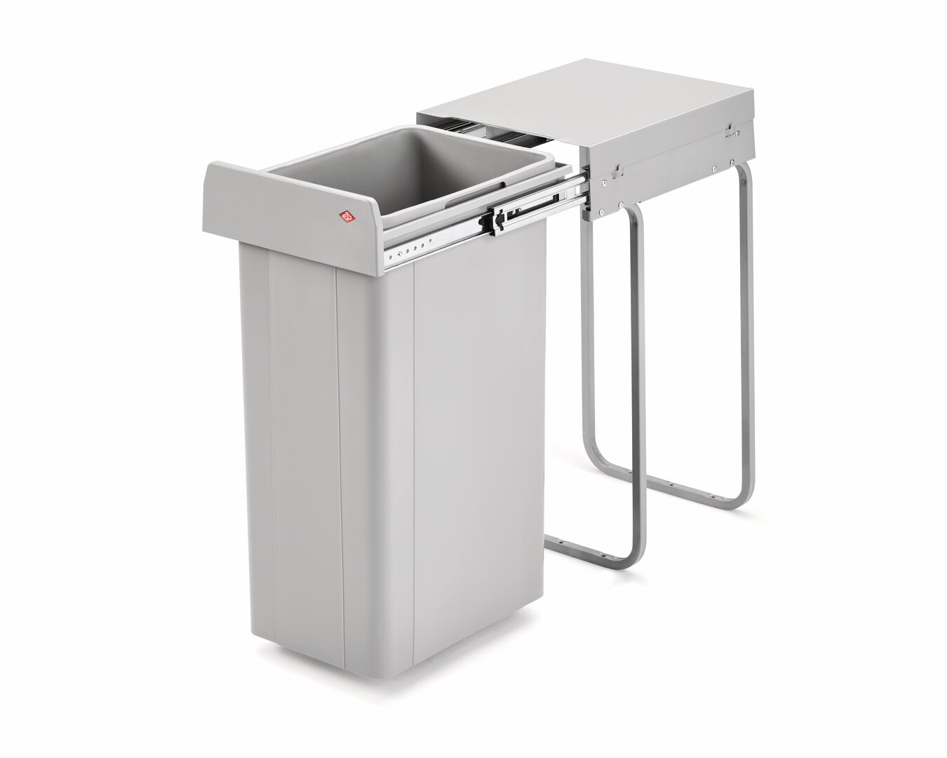 Das Mülltrennsystem ist in einer durchdachten Auszugstechnik speziell für Drehtüren konzipiert. Dem Eigenbedarf entsprechend kann das Modell mit einem Abfallvolumen von 32 Litern erworben werden. Der Einzelbehälter ist an den Rändern mit Griffmulden ausgestattet, die das Herausheben zur Entsorgung des Mülls erleichtern. Zur Grundausstattung gehört ein Gesamtdeckel, der auf dem Gestell befestigt wird und sich zum Reinigen mühelos abnehmen lässt. Der Vollauszug mit robusten Führungsschienen ist dank der Griffleiste im Frontbereich einhändig bedienbar. Die Montage des Mülltrennungssystems erfolgt unkompliziert auf dem Schrankboden.