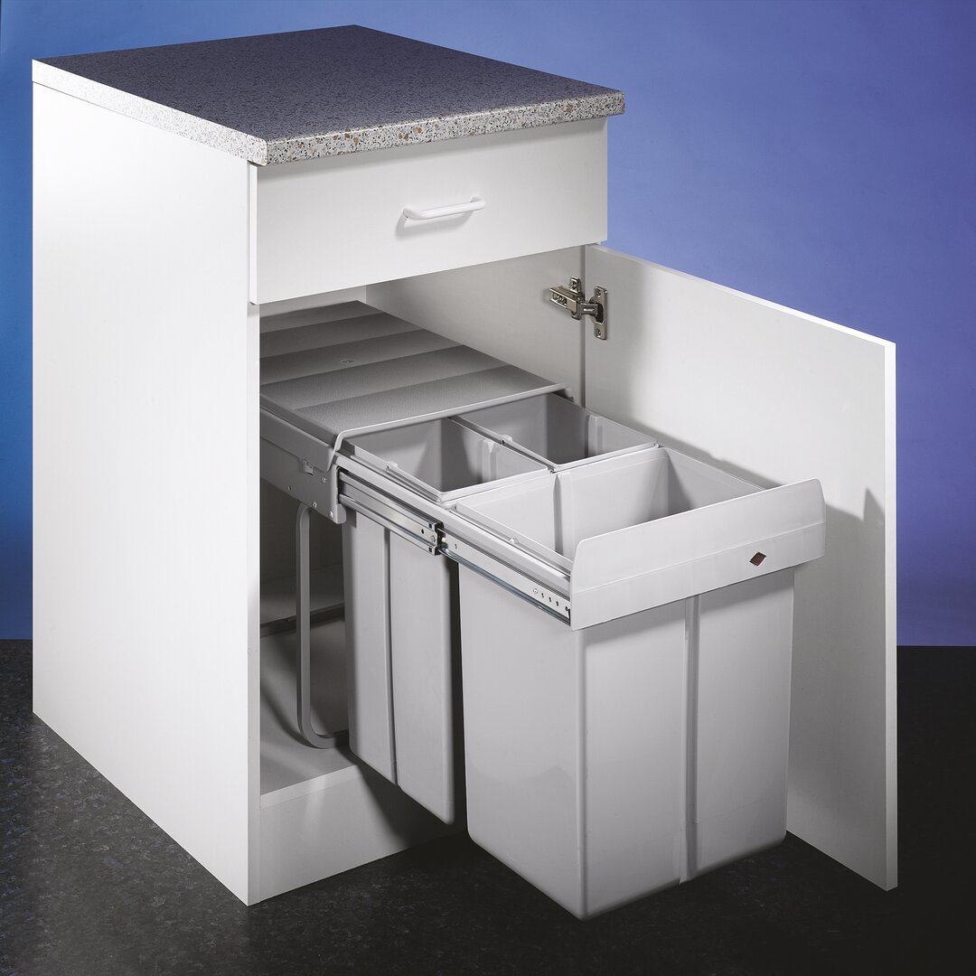 Durchdacht designt bietet sich das für Küchenunterschränke mit einer Drehtür gefertigte Mülltrennsystem Trenta 5 als platzsparende Hilfe in der Küche an. Es stellt ein großes Gesamtvolumen von 40 Litern zur Verfügung, was sich hervorragend für Mehrpersonenhaushalte eignet. Der Abfallsammler setzt sich aus einem großen Behälter für 20 Liter und zwei kleineren Behältern mit einem Füllvolumen von jeweils 10 Litern zusammen. Das schafft gute Voraussetzungen für eine sorgfältig getrennte Entsorgung von Wertstoffen, Biomüll und sonstigen Abfällen. Der abnehmbare Gesamtdeckel verläuft über alle Behälter hinweg, sodass eine von außen bemerkbare Geruchsbildung vermieden wird. Ein Vollauszug erleichtert die allgemeine Nutzung des Mülltrennungssystems. Der Einbau erfolgt direkt am Schrankboden, wobei eine Mindesteinbaubreite von 400 mm erforderlich ist.