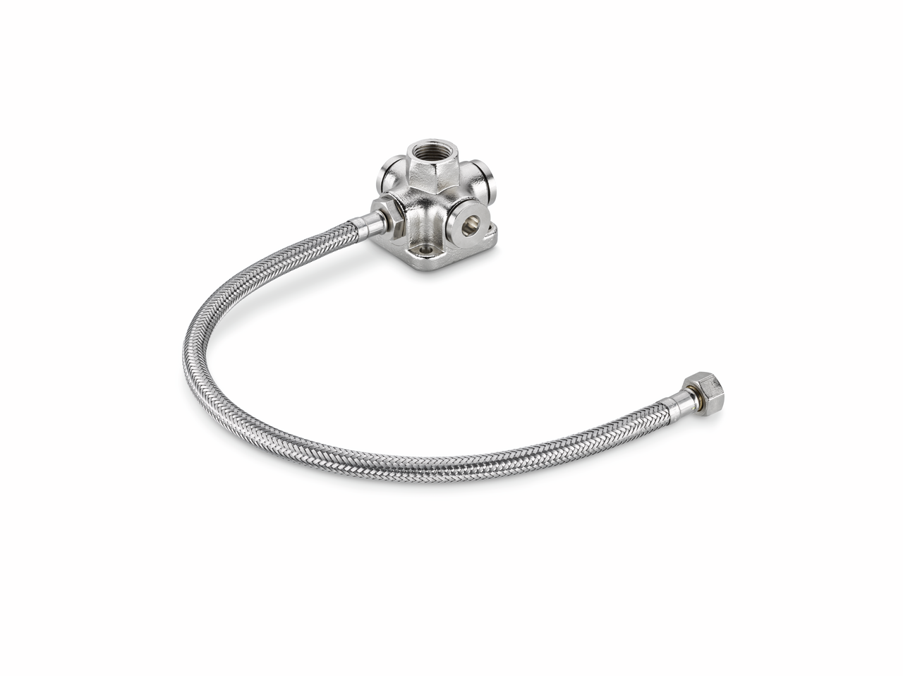 Der Water Box Verteiler erlaubt den Anschluss mehrerer Wasserbraucher auf eine platzsparende Art an einem Versorgungspunkt. Sie wird aus dem speziellen Sanitärmessing CB 757S gefertigt und ist für Trinkwasser geeignet. Zur Verfügung stehen drei Anschlüsse mit einem ½“ Innengewinde inklusive Dichtungsstopfen sowie ein ½“ Anschluss mit offenem Innengewinde. Durch den zugehörigen Flexschlauch aus Edelstahlgeflecht ist eine individuelle Montageposition des Wasserverteilers möglich. Er hat die Maße 55 x 55 x 55 mm (H x B x T).