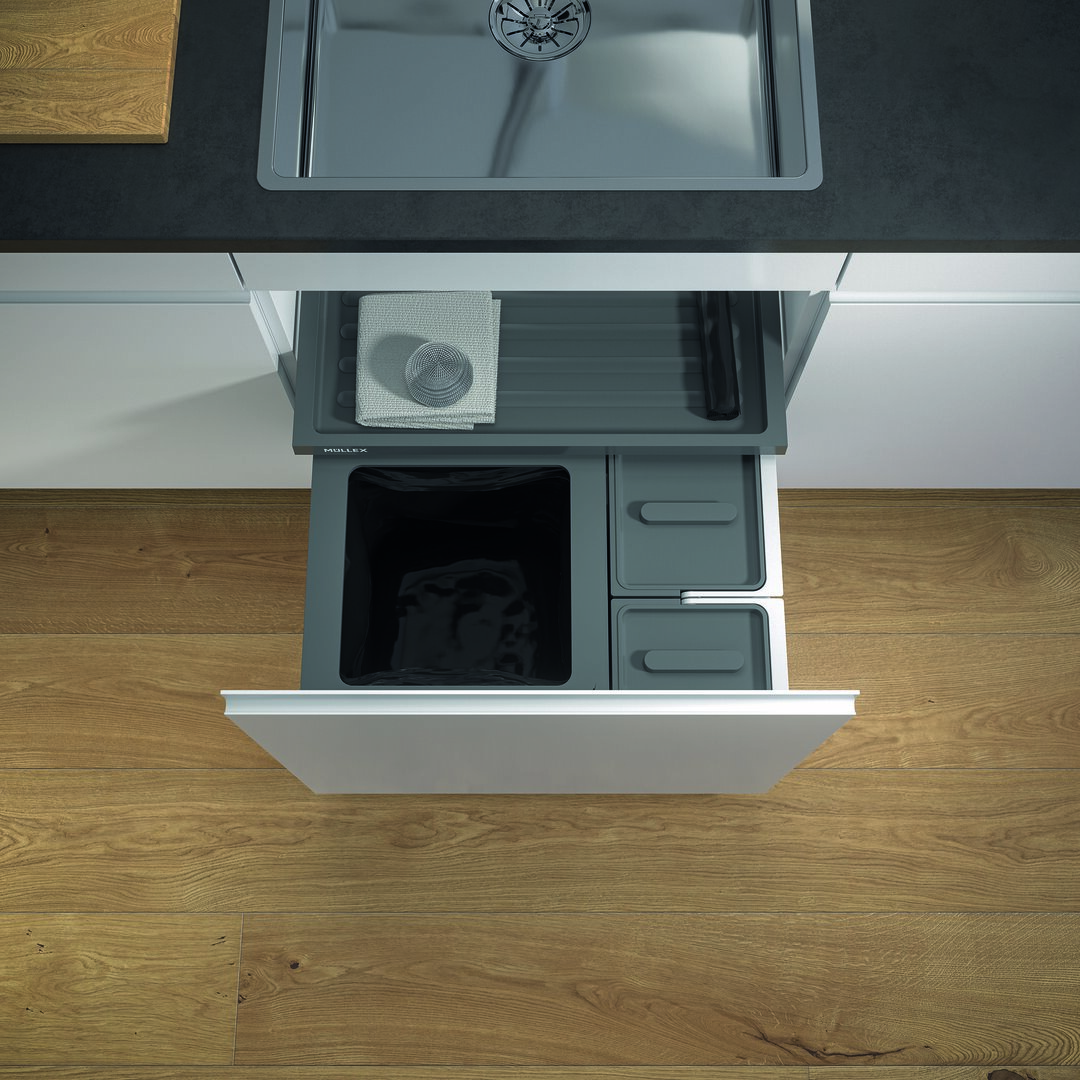 Das Mülltrennsystem X-LINE 600/M5 ist eine echte Bereicherung, wenn es um eine sachgerechte Aufbewahrung des Küchenabfalls geht. Es ist designt für den platzsparenden Einsatz in bestehende Schubladenauszüge. Dabei überzeugt es durch ein großes Abfallvolumen von 48 Litern, das in Abfalleimer mit jeweils 1 x 35 Liter, 1 x 8 Litern und 1 x 5 Litern aufgeteilt ist. Hinzu kommen zwei Zusatzbehälter mit je 1 Liter und 0,5 Liter. Alle Behälter lassen zum Entleeren sowie zum Reinigen mit nur einem Handgriff entnehmen. Ein weiteres Ausstattungshighlight ist die auf Kunststoffschienen gelagerte Basic Schublade mit Teilauszug. Sie dient als zusätzliche Ablage für Putzutensilien und Müllbeutelrollen. Zugleich übernimmt sie die Funktion eines geruchsmindernden Gesamtdeckels. Dank der variablen Einbautiefe ist das Mülltrennungssystem auch in Unterschränken verwendbar, in denen sich Sanitärinstallationen befinden.