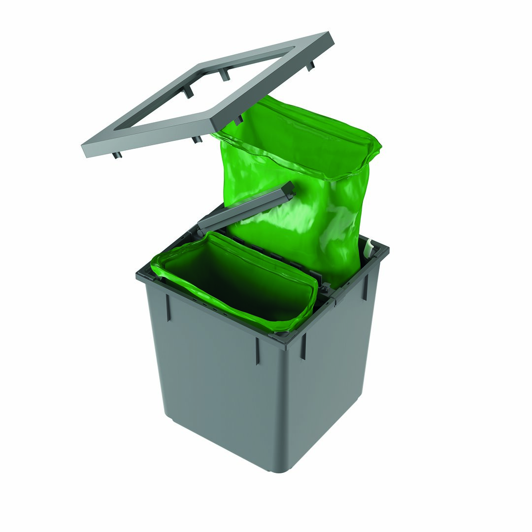 Der Trennsteg unterteilt einen 35 Liter Hauptbehälter, so dass zwei 17 Liter Abfallsäcke eingespannt werden können. Der Trennsteg verhindert, dass Müll in die Spalte zwischen den zwei Müllsäcken fällt oder Müllsäcke abrutschen.