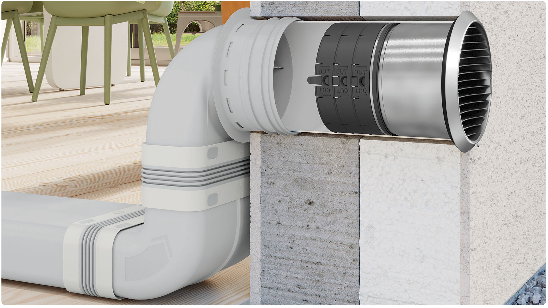 COMPAIR PRIME flow® hebt das Thema Küchenlüftung in eine neue Dimension. Alle Komponenten des Systems sind neu gedacht und innovativ gestaltet – vom herstellerneutralen Anschluss an den Dunstabzug bis zum Mauerkasten. Das ökologische Produktdesign und die sozial verantwortungsvolle Herstellung steigern die Nachhaltigkeit deutlich.