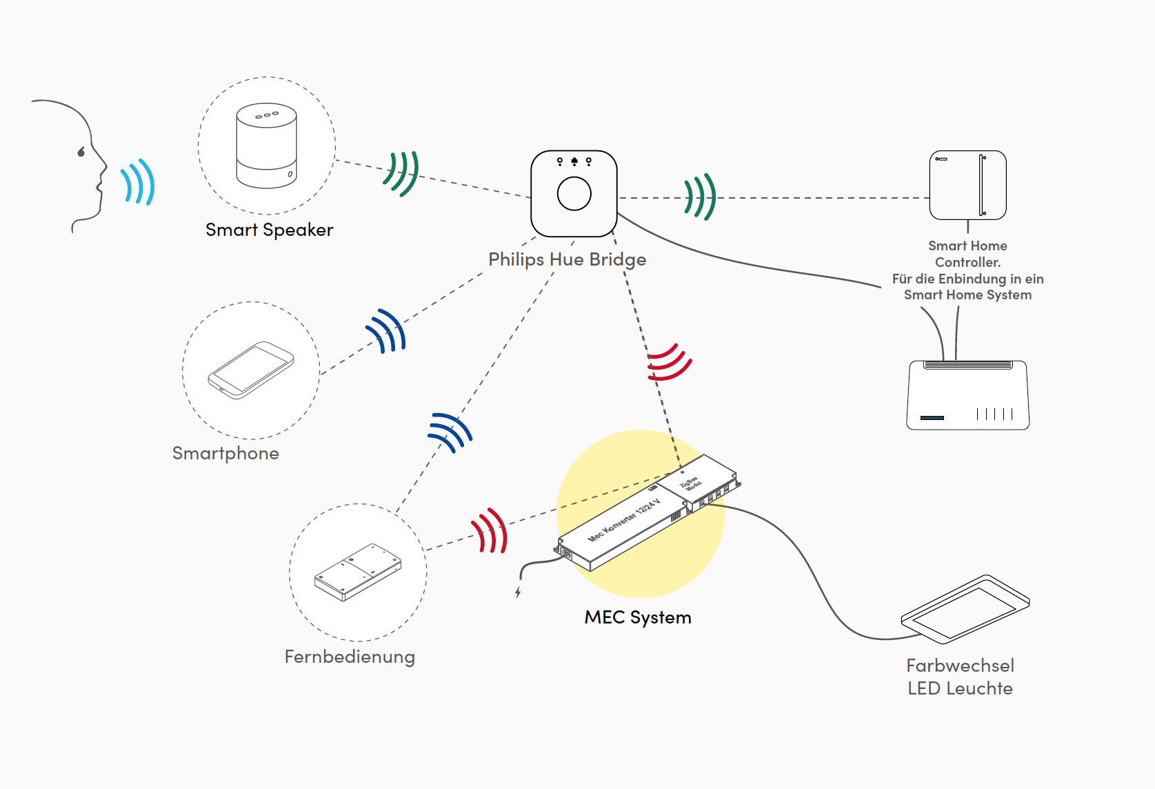 Die Funktion des LUMICA® MEC 1- oder 4-Kanal-Funk/ZigBee-Moduls mit Amazon Alexa und Google Assistant sowie der Philips Hue Bridge ist zum Zeitpunkt der Erstellung dieses Magazinbeitrags geprüft worden. Eine zwischenzeitliche Änderung oder Weiterentwicklung der Apps unterliegt nicht unserer Kontrolle. Wir erheben keinen Anspruch auf Richtigkeit und Vollständigkeit der Angaben. Andere Intelligente Persönliche Assistenten (IPA, Sprachassistenten) können ebenfalls genutzt werden. Beachten Sie bitte die Gebrauchsanweisung des jeweiligen Anbieters. – Nicht kompatibel mit Apple HomeKit!
