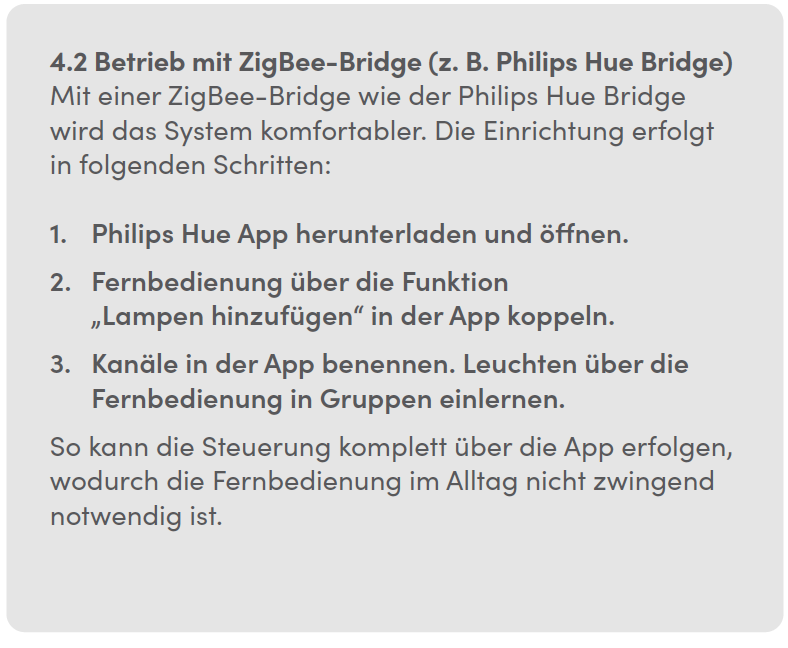 Bei Anschluss an ein vorhandenes Smart Home System muss die Philips Hue Bridge über die App des Smart Home Systems angemeldet werden.