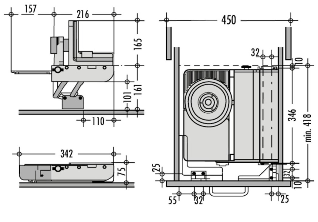 Zur Montage in Schubkästen ab 450 mm Korpusbreite. Voraussetzung: Lichtes Innenmaß >344 mm. Steht vor der Arbeitsplatte. Abstand Schubkastenboden bis Arbeitsplattenoberkante: min. 116 mm, max. 161 mm.