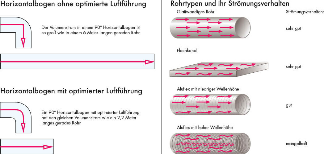 Glattwandige Luftkanäle leisten der strömenden Luft den geringsten Widerstand. Ob aus Kunststoff oder Metall, mit COMPAIR® von Naber liegen Sie richtig. Vermeiden Sie Reduzierungen des Querschnitts und enge Radien von Bögen.