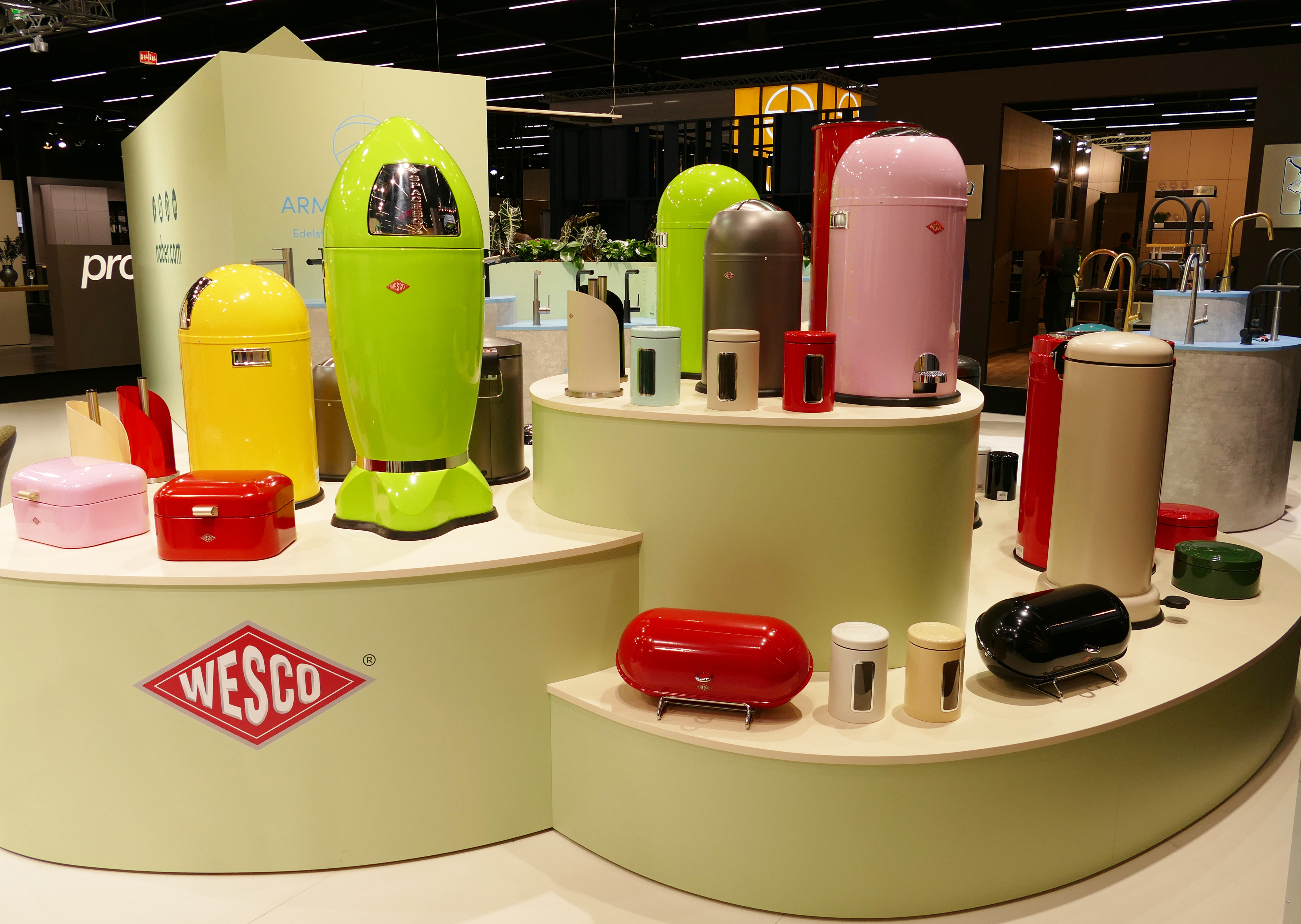 Wo die hervorragende Qualität des Küchenzubehörs an Stand E 51 der küchenwohntrends direkt ersichtlich war, zog sie das Fachpublikum magnetisch an. Strahlend präsentierten sich etwa die WESCO® Multibehälter aus pulverbeschichtetem Stahlblech in ihrer hochwertigen Verarbeitung, der attraktiven Farbvielfalt und dem ikonischen Design. Wie dieses Sortiment vermittelten auch die Armaturen, die Nischenausstattung, die Stühle, Hocker und Tische sowie das weitere Zubehör eine so simple wie relevante Botschaft: Im Zuhause der Menschen ist die Küche der Ort, wo Komfort auf Lebensfreude trifft und Genuss auf ein stilvolles Ambiente.