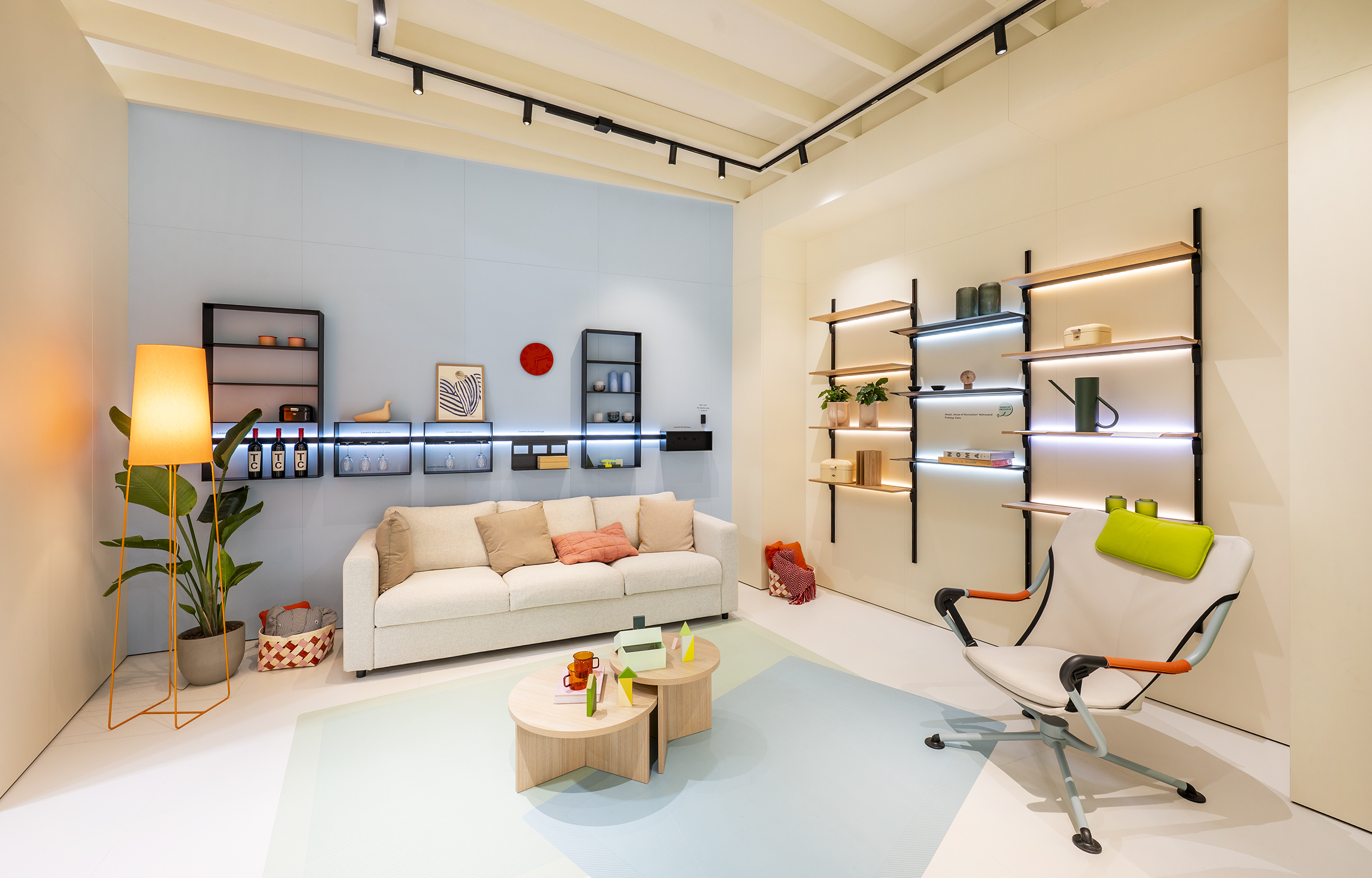 Offene Regale in Innenräumen wirken angenehm wohnlich. Einige der exzellenten Reling- und Regalsysteme im ACCOMODA® Sortiment beziehen das Thema Beleuchtung mit ein. Denn Lichtszenarien lassen sich noch eindrucksvoller gestalten, wenn Relingschienen oder Regalelemente Teil des Konzeptes sind. In Löhne präsentierte Naber als herausragendes Beispiel Lucento, das flexible System aus Aluminium mit schwarz veredelter Oberfläche. Das LED-Licht in den Relingschienen kann gedimmt und in seiner Farbtemperatur stufenlos variiert werden.