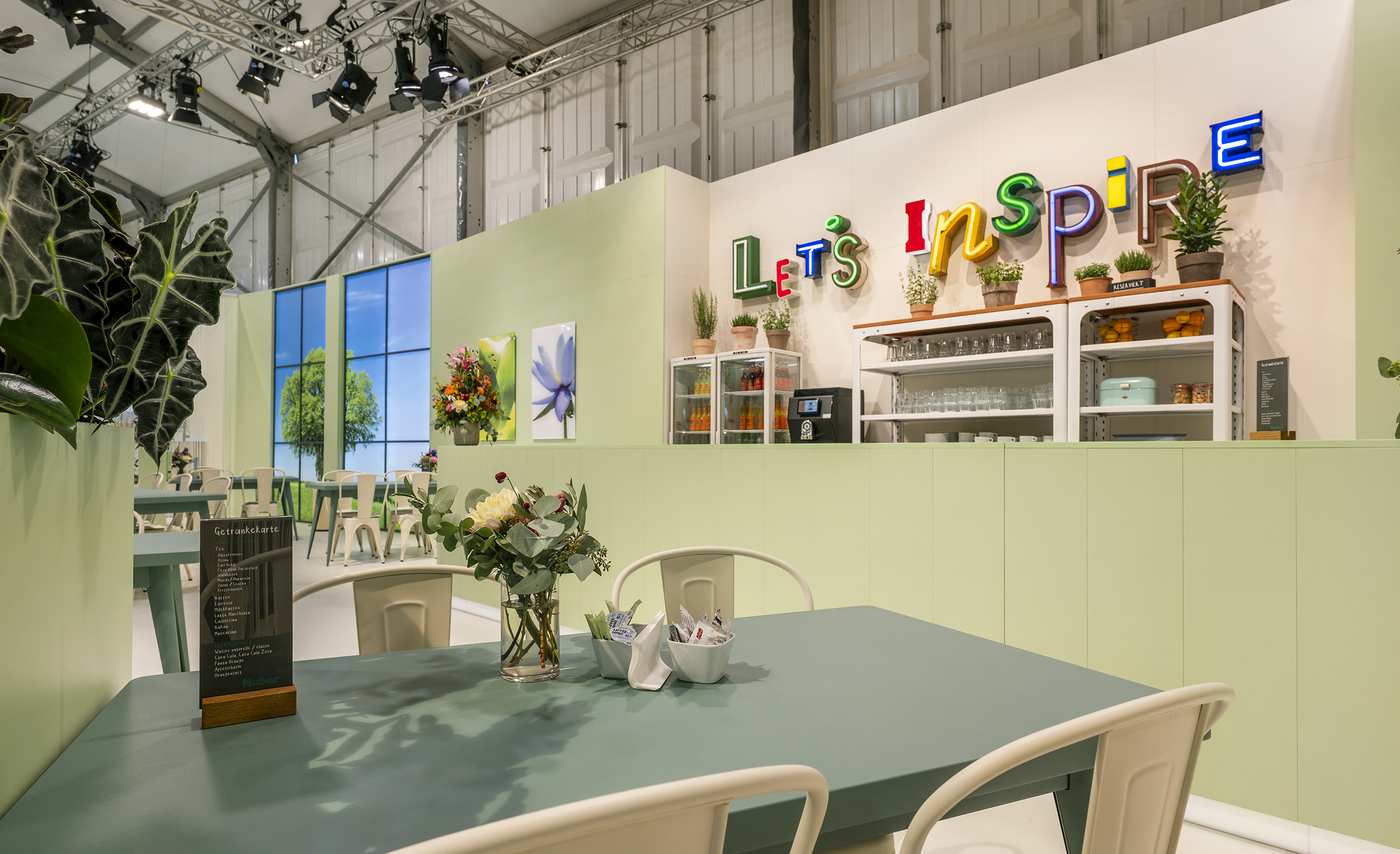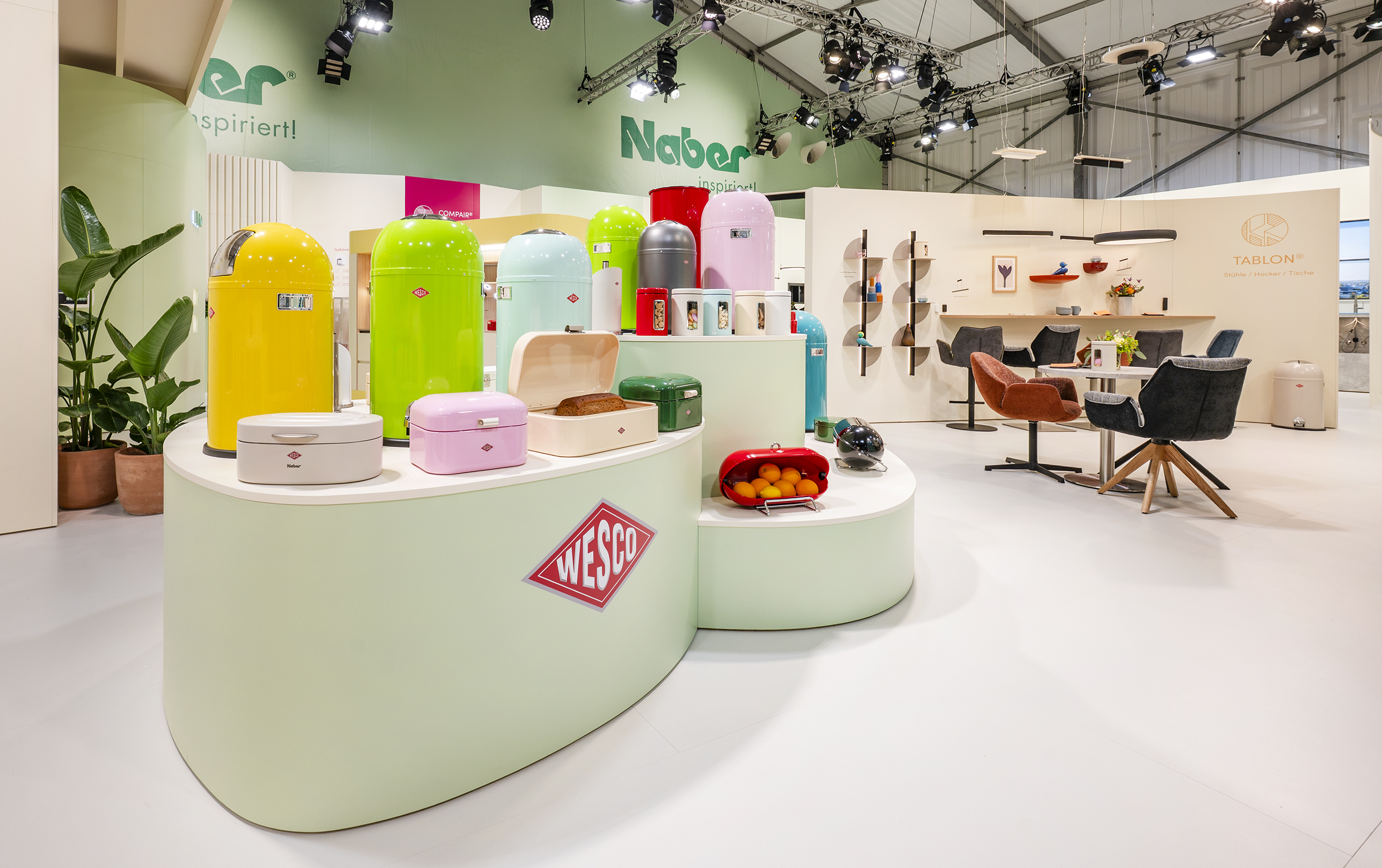 „Let’s inspire“, das Wandobjekt aus bunten Buchstaben, war im großzügigen Bistro- und Besprechungsbereich des Naber Messestands angebracht. Wie immer wurden spannende Gespräche mit Messebesuchern aus dem In- und Ausland geführt, die interessante Anregungen für künftige Produktentwicklungen enthielten. Positives Feedback gab es besonders häufig zu den WESCO® Multibehältern. Im Zentrum des Naber Areals zeigten sie ihre Stärken wie auf einer Insel farbenfroher Exklusivität.