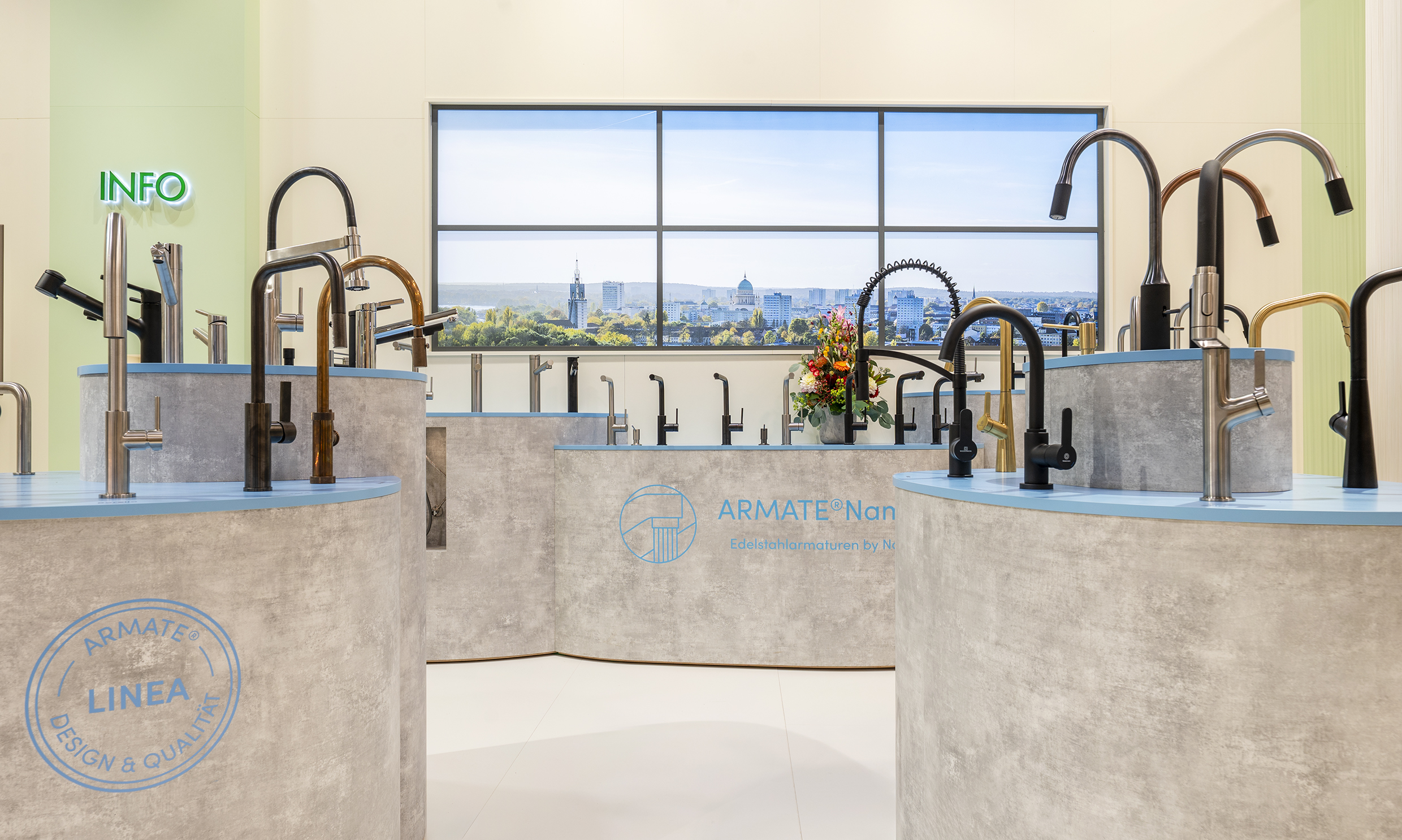 Nabers Innovationskraft ist sowohl in einzigartigem Spülen- und Armaturen-Design als auch in ergänzenden oder funktionalen Neuerungen erkennbar. Namor®, die Serie hochwertiger Küchenarmaturen aus Edelstahl 304, umfasst jetzt auch den passenden Spülmittelspender. In der imposanten Vielfalt der Küchenarmaturen auf der area30 gewannen die aktuellen Neuzugänge im ARMATE® Sortiment besondere Aufmerksamkeit. Die Wasserwerk-Serie Grace zum Beispiel beeindruckte mit ihrer leicht verspielten und zugleich robusten Eleganz in attraktiven Farbkombinationen sowie komplett in Schwarz. Dagegen rückte Vireo 6 mit flexiblem Soft-Touch-Schlauch den Bedienkomfort und außergewöhnlich große Handlungsspielräume in den Fokus.