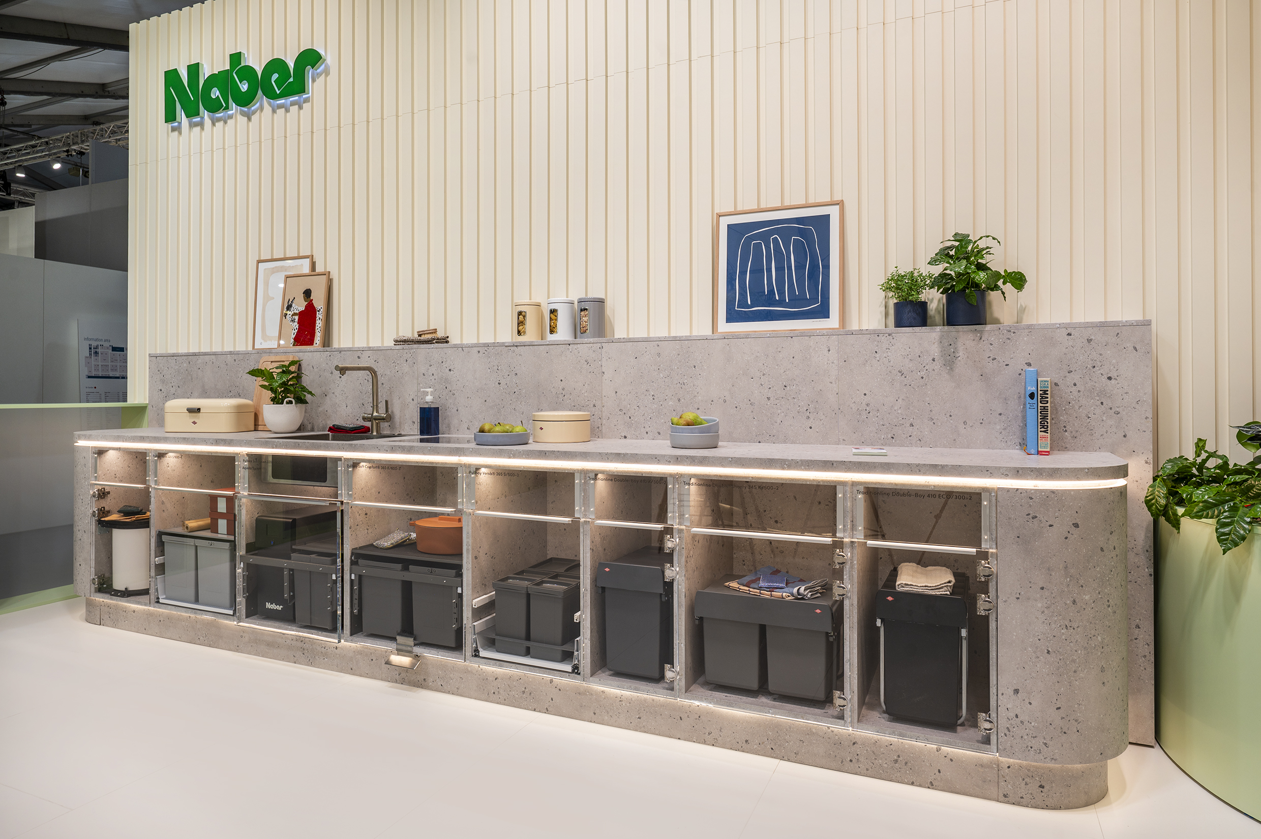 Mit Aqvella bietet Naber erstmals ein praktisches Kühl- und Filtersystem an, das an eine formschöne Küchenarmatur gekoppelt ist. Mit dem Drehgriff links an der Armatur wird eingestellt, ob gesprudeltes oder gekühltes und gefiltertes stilles Wasser fließen soll. Die Aqvella-Technikeinheit steht im Spülenunterschrank, und als Experte für platzsparende Abfallsammler-Systeme zeigte Naber auf der area30 natürlich Kombinations-Lösungen für diese Spezialfälle. Beispielsweise Pullboy Soft Fusion® von WESCO®: Die leichtgängige Auszugstechnik kann in Schränke mit loser Frontblende integriert werden und lässt links neben den Abfallbehältern Platz für die Ausrüstung zur Wasserkonditionierung.