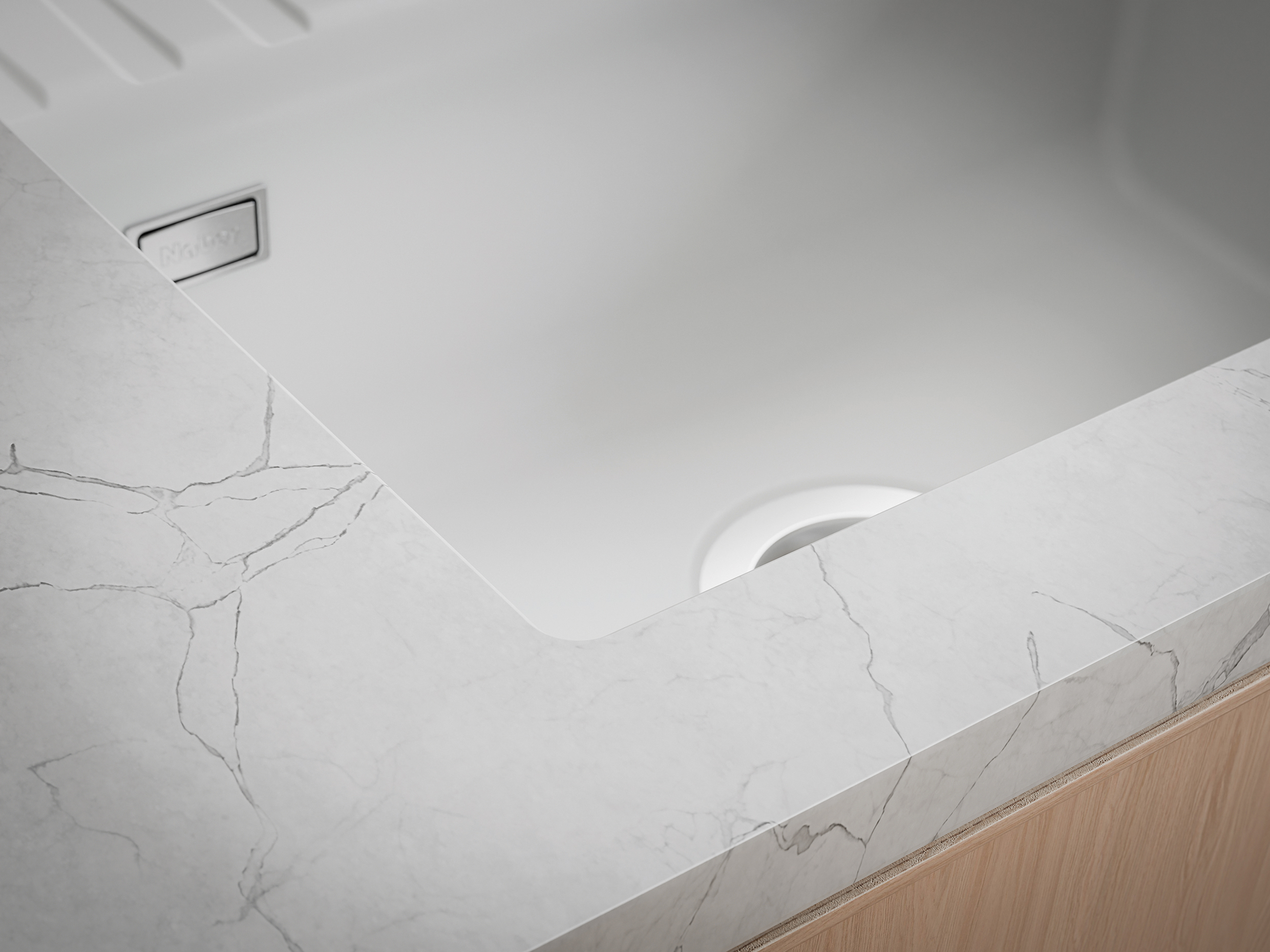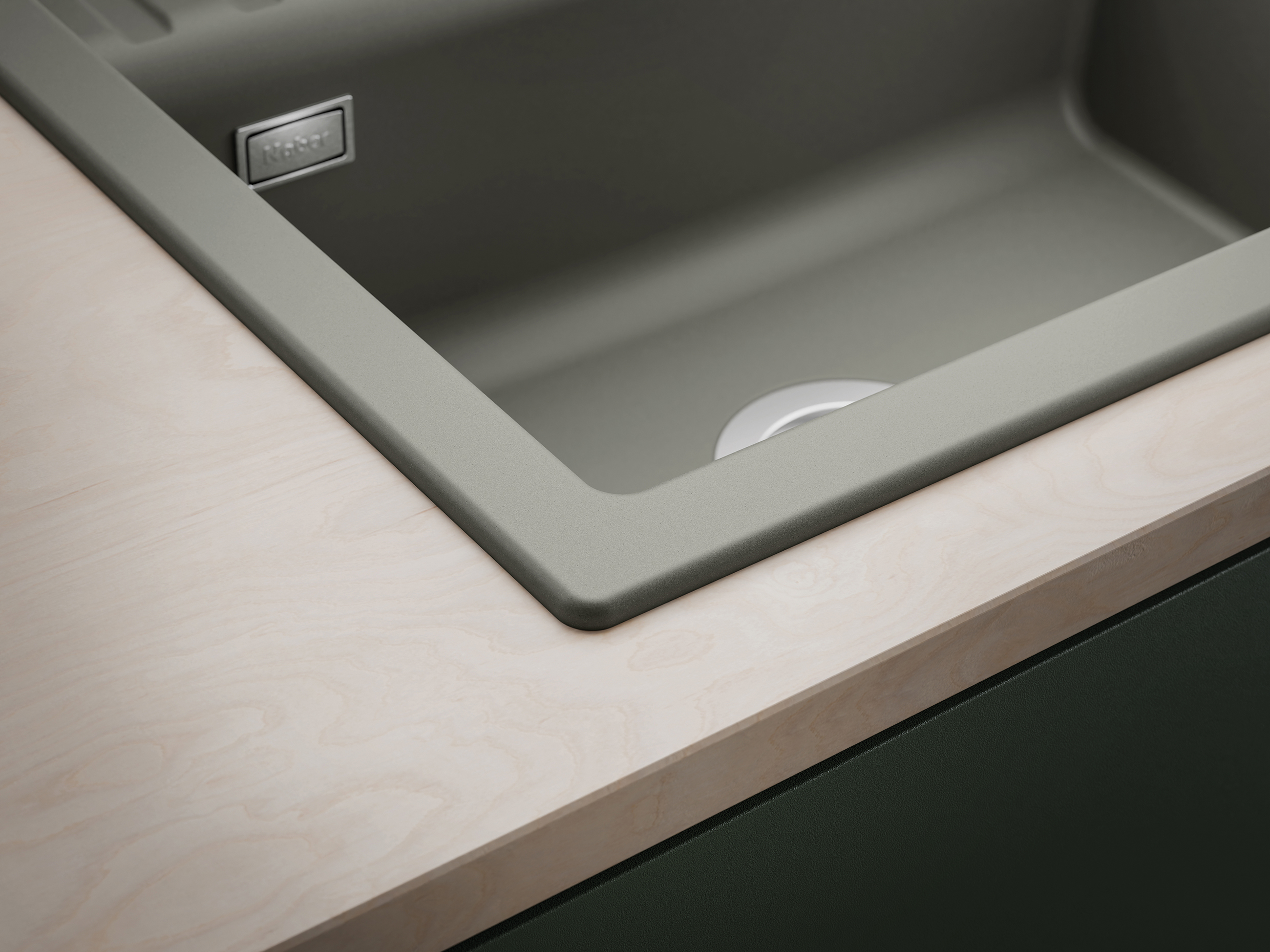 Inspiriert von fließendem Wasser, weist SILQUA weiche innere Radien auf, die die Gefahr von Schlagschäden verringern und angenehme Berührungen der Hände mit der Spüle implizieren. Die integrierte Armaturenbank kann als zweite Handlungsebene genutzt werden. Hier trocknen beim kleinen Abwasch die Tasse, das Schälchen und der Spülschwamm. Das Wasser kann dank der Ablaufrillen und der abgerundeten Kante hervorragend abfließen.