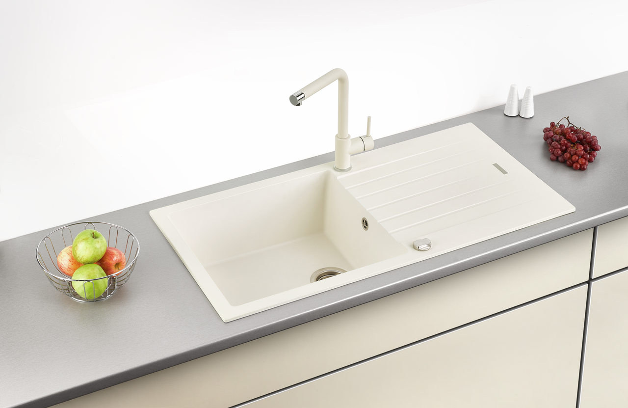 Built-in sink. Composite, with large bowl and draining surface, reversible. 3½" basket strainer valve flush with rotational excenter fitting, chrome plated.