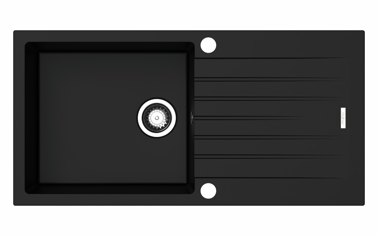 Built-in sink. Composite, with large bowl and draining surface, reversible. 3½" basket strainer valve flush with rotational excenter fitting, chrome plated.