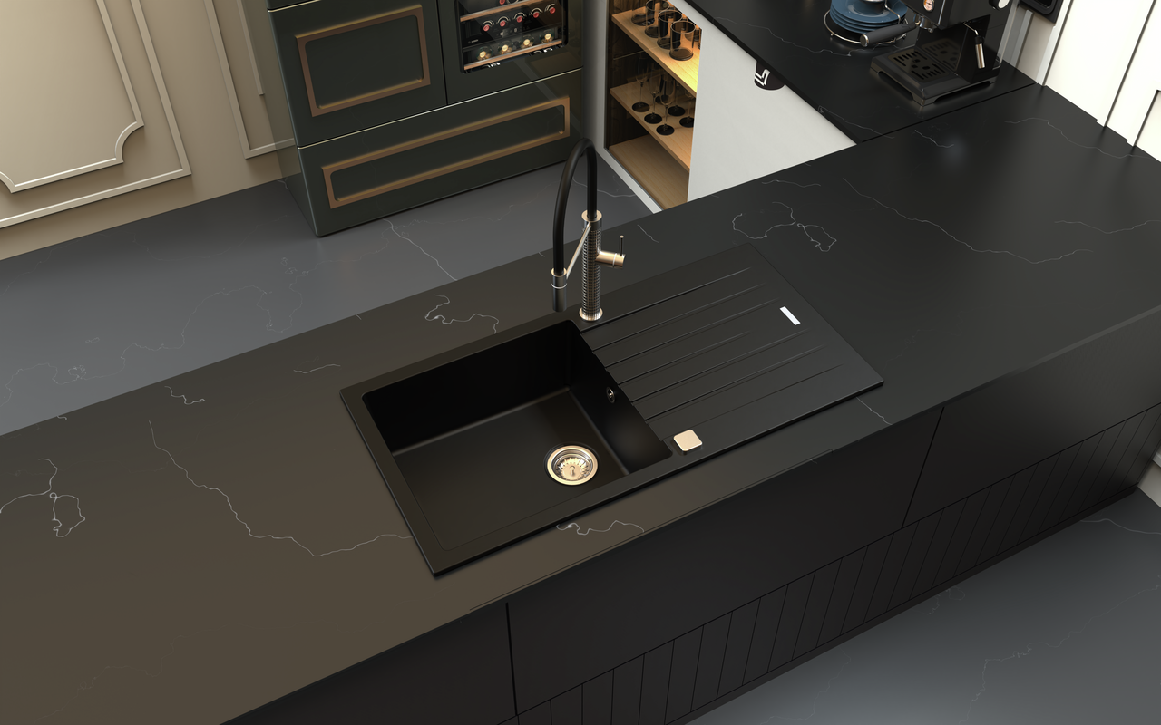With its elegant granite look, the Angola 100 L composite fitted sink sets a striking accent within the kitchen unit. In addition to the visual aspects, it convinces with functional details, including the grooved draining surface for placing the cookware. Complemented by matching accessories, the kitchen sink can be used as an additional work surface, for example to prepare food and peel fruit. Composite material is used in the production of the sink, which is characterised by its durable and easy-care properties thanks to the high quartz content. Due to the material properties, it is perfectly suited for use with a hot water set up to 100 °C. Equipped with holes on both sides, the installation of the kitchen sink with the basin is reversible on the left or right side. The chrome-plated basket valve with associated rotary eccentric fitting for opening and closing is part of the basic equipment. Various high-pressure fittings for the built-in sink are available to match the granite-look colour palette.